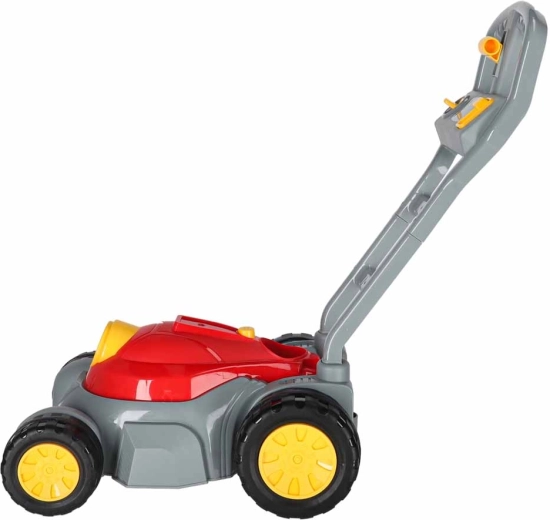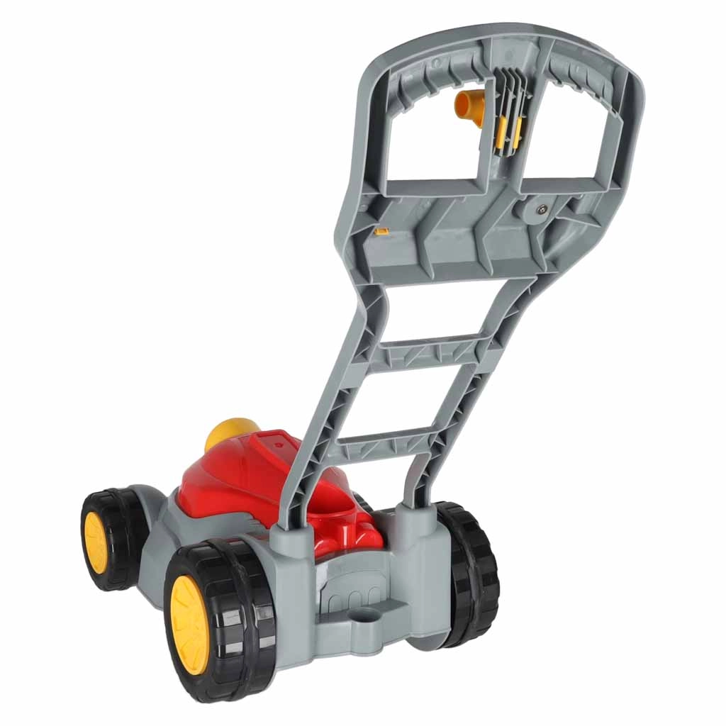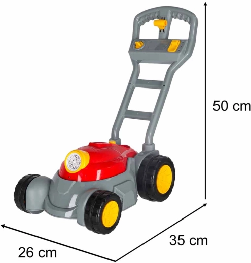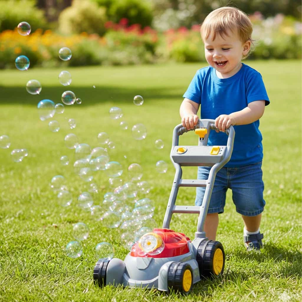 Divertido cortacésped infantil que, al desplazarse, crea burbujas de jabón, motiva al juego al aire libre y atrae con efectos de luz y sonido. Manejo fácil con un solo botón, empuñadura ergonómica y cuatro ruedas estables para jugar con seguridad en el jardín y en casa.