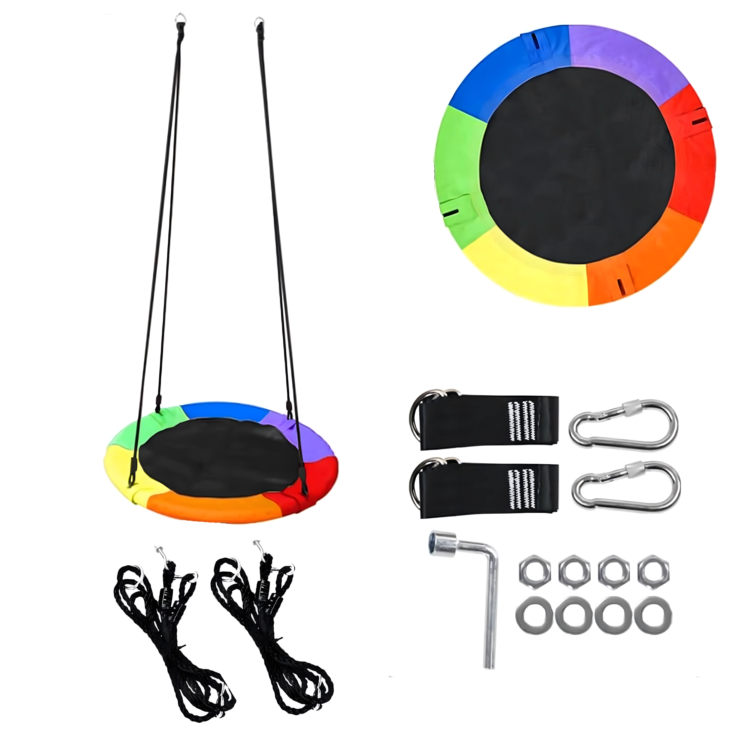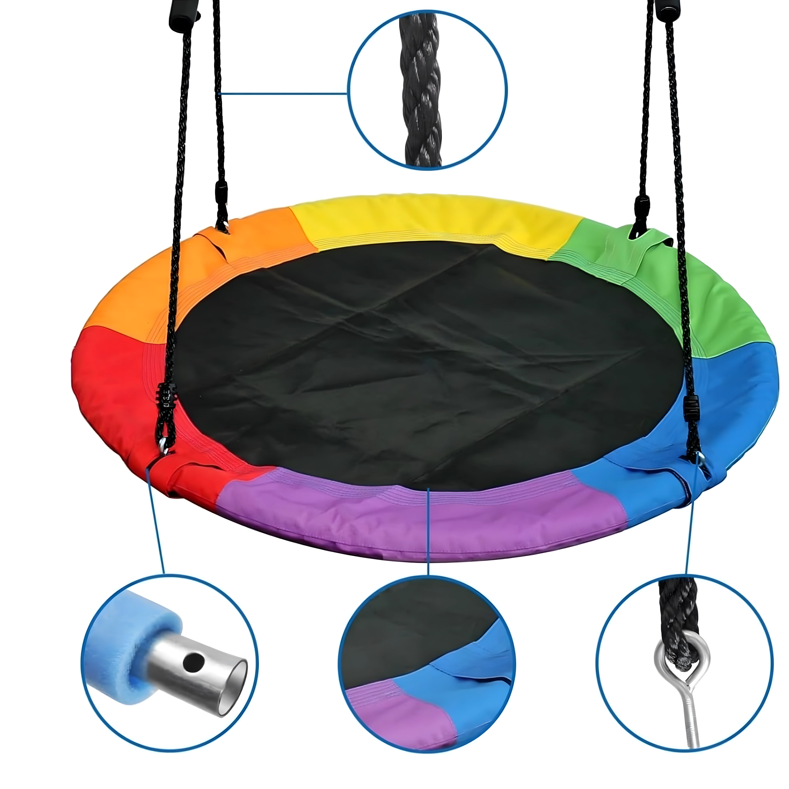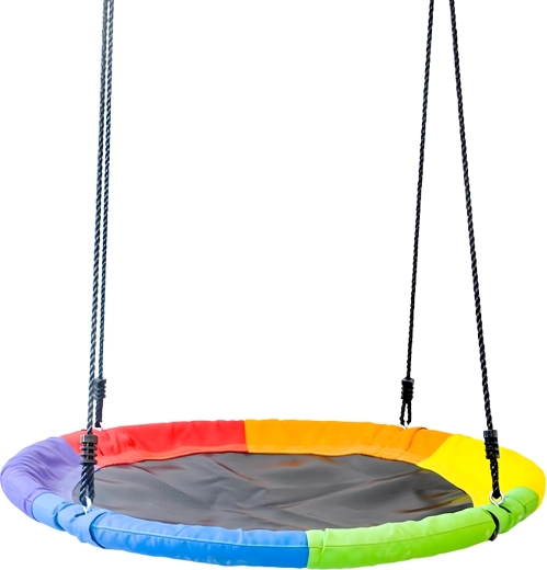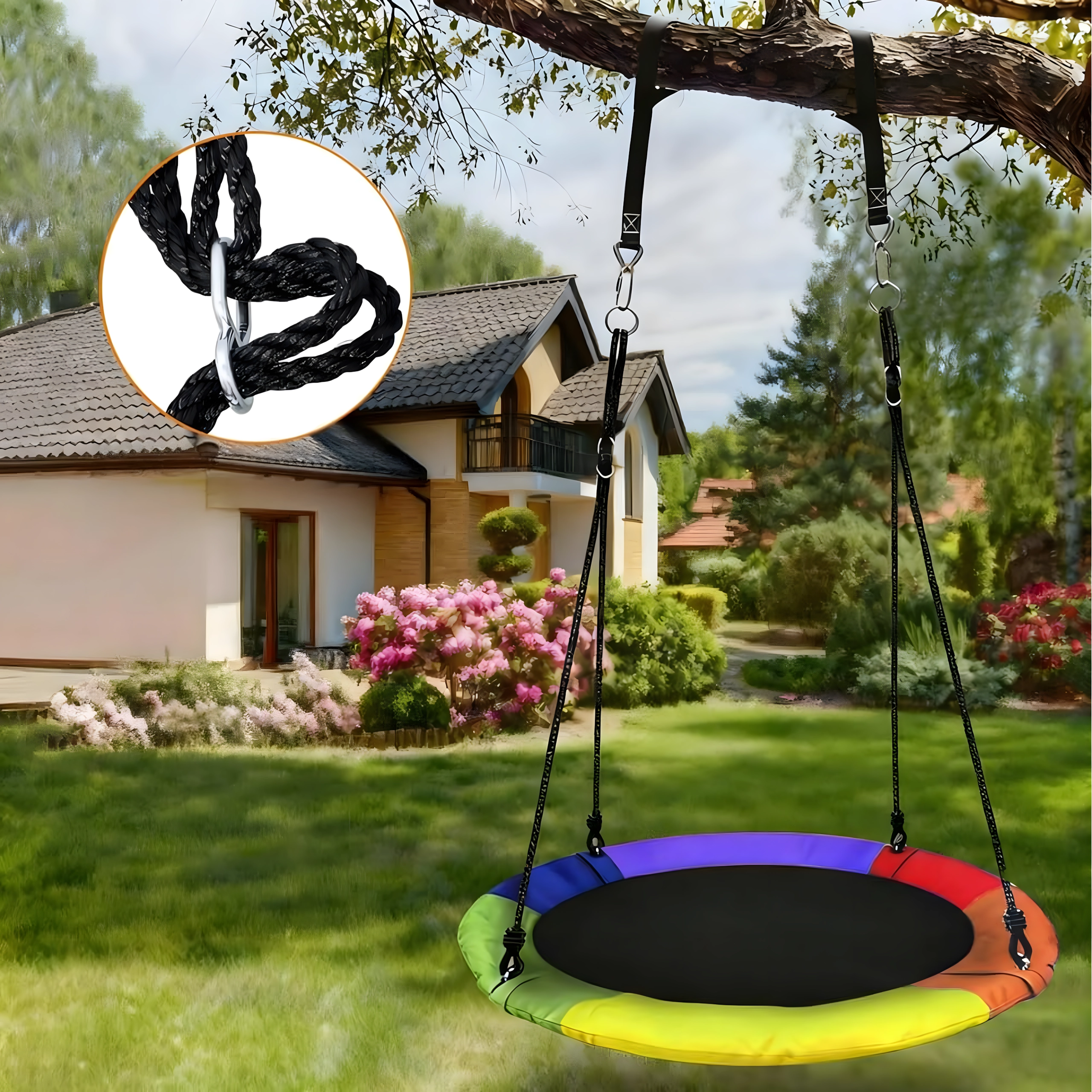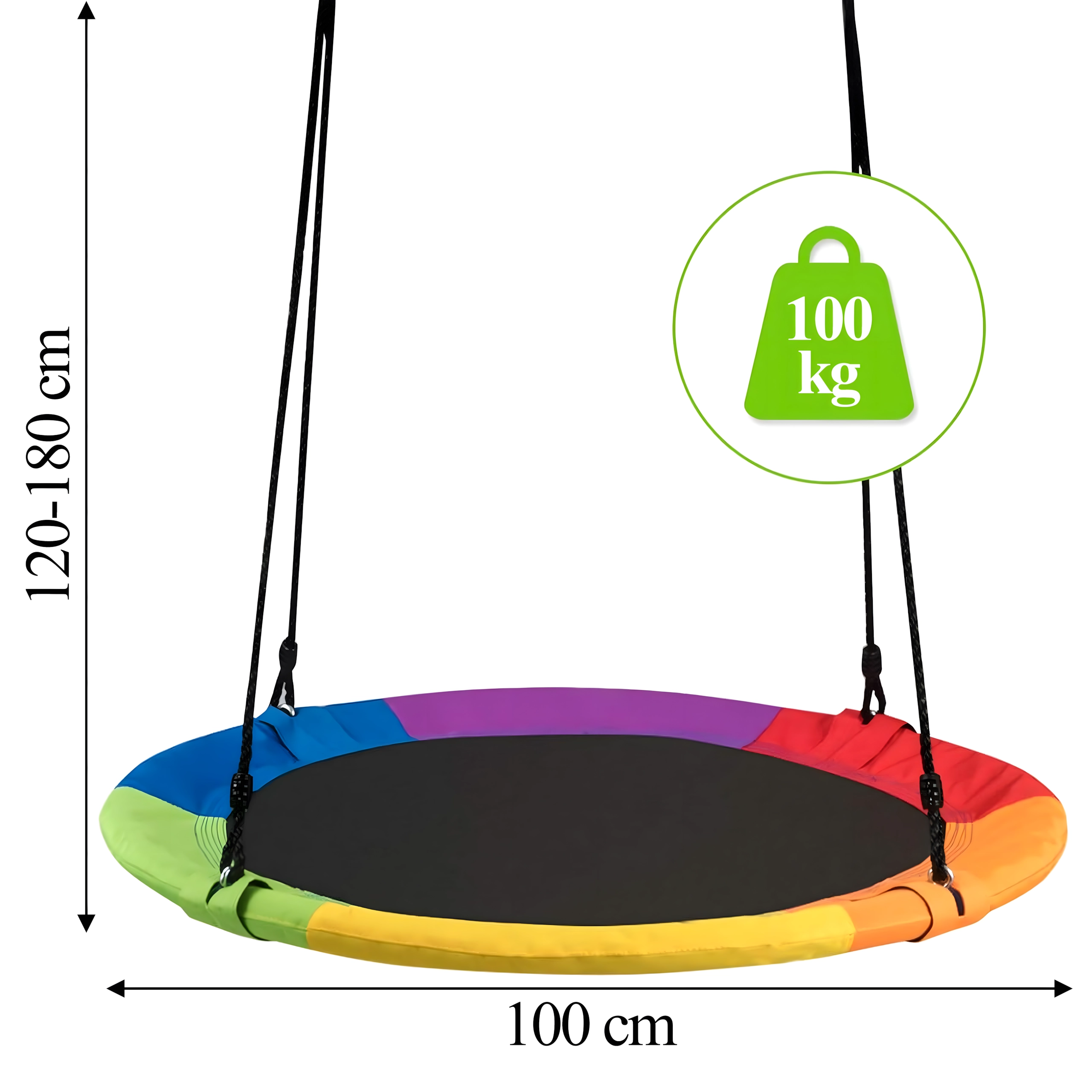 Gran columpio redondo tipo nido de cigüeña de 100 cm de diámetro que ofrece a los niños horas de diversión y relax al aire libre. Gracias a su amplio asiento es ideal para sentarse y tumbarse, soporta a varios niños a la vez y cuenta con cuerdas trenzadas resistentes, tejido duradero y mosquetones metálicos para una sujeción segura. El paquete incluye correas para colgar en el árbol y todos los accesorios necesarios.