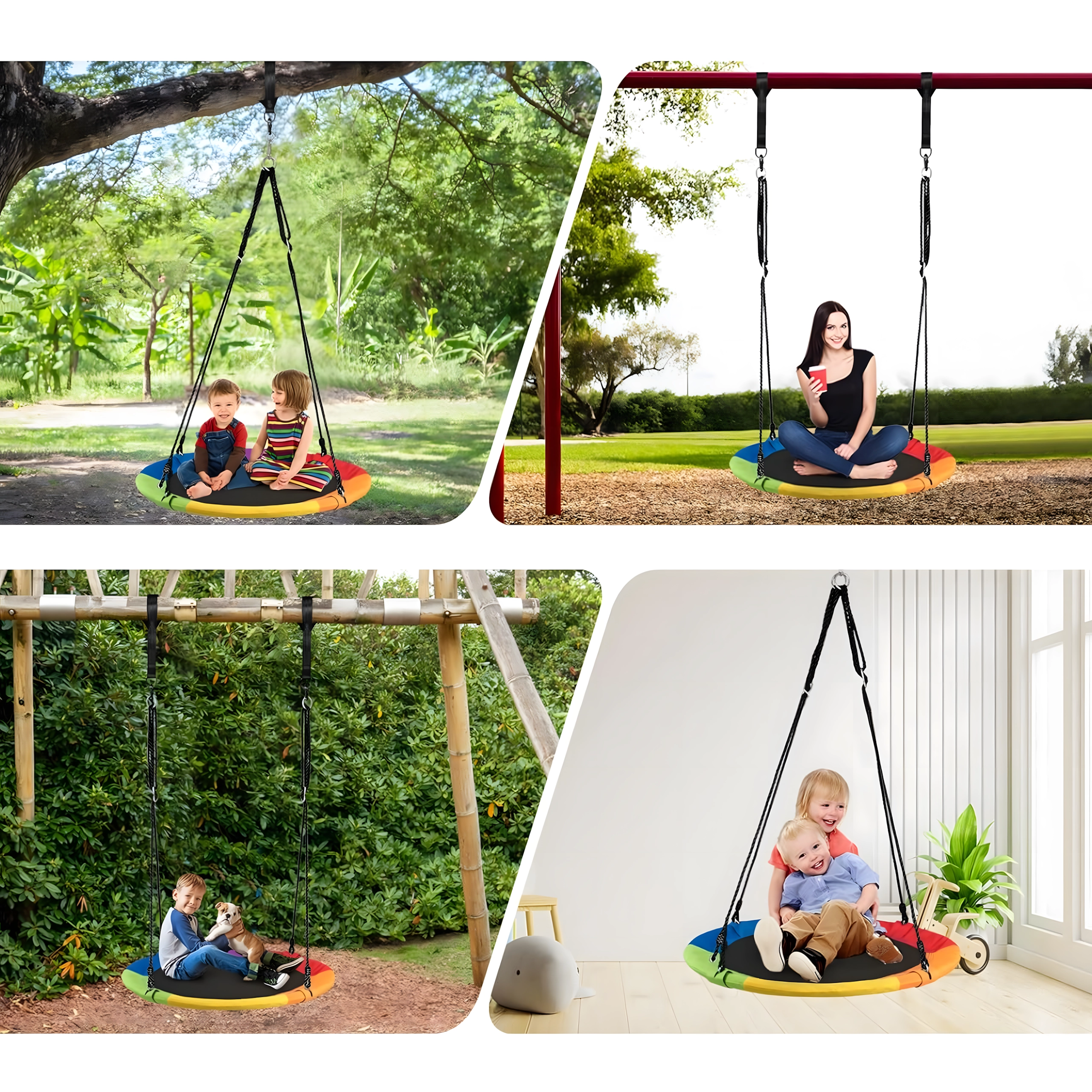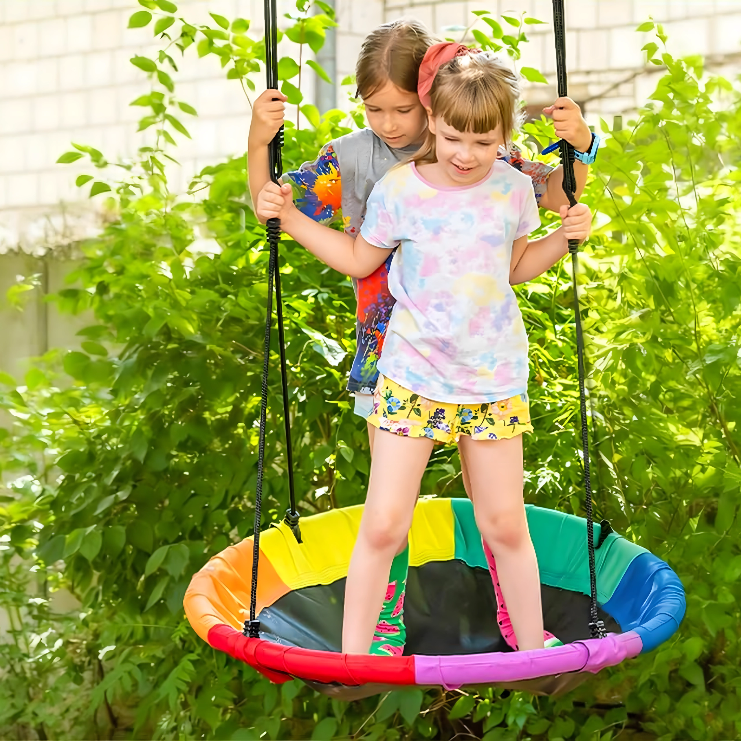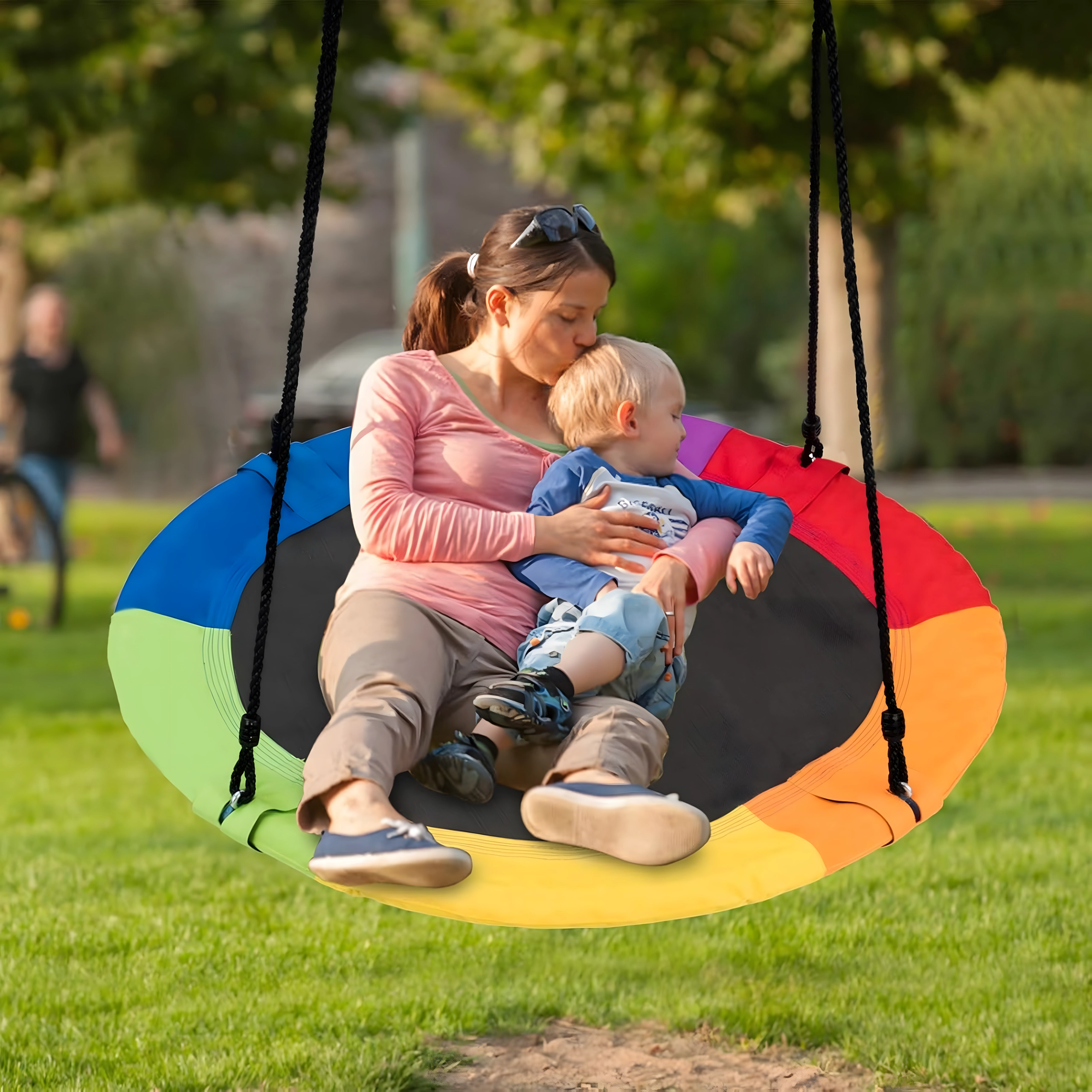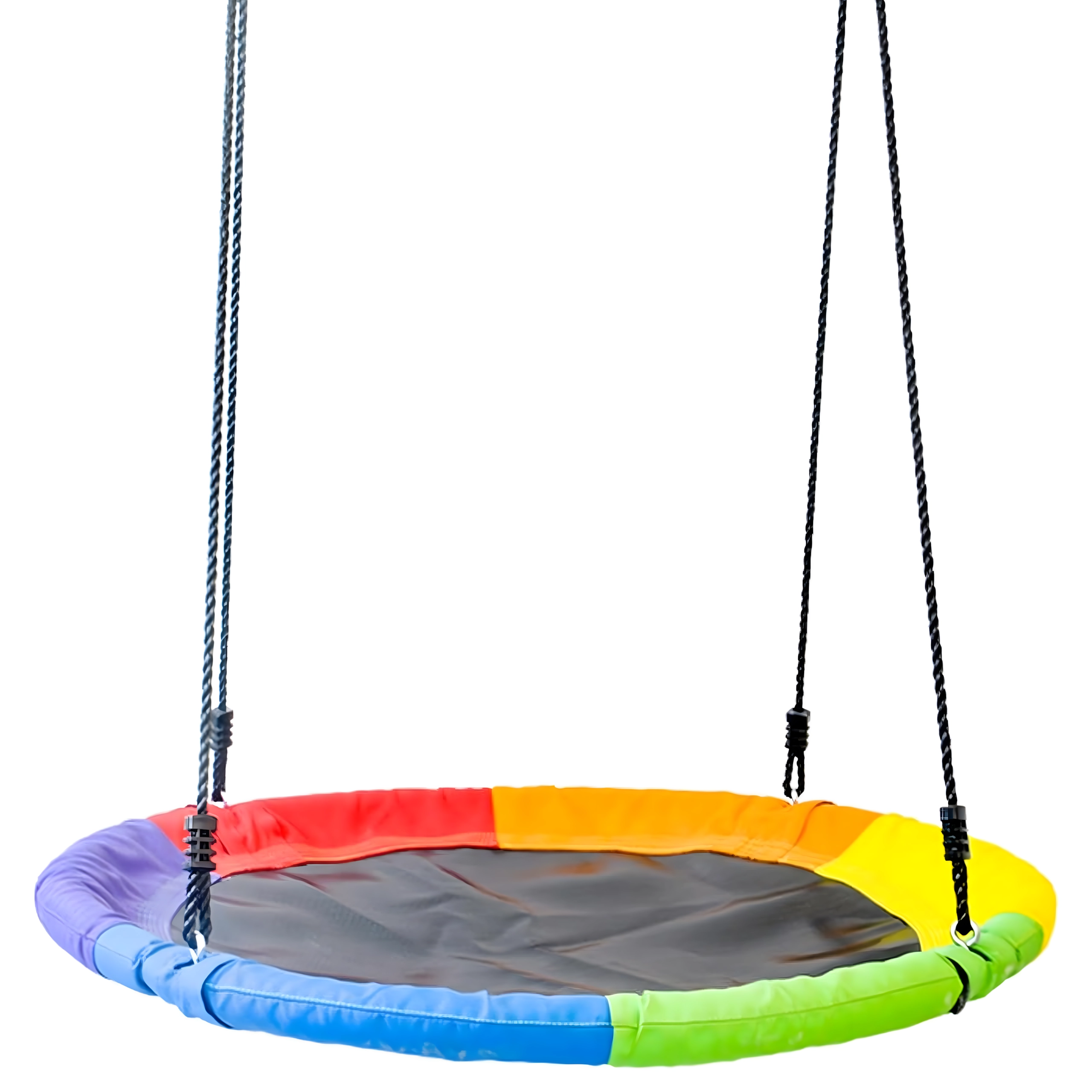 Gran columpio redondo tipo nido de cigüeña de 100 cm de diámetro que ofrece a los niños horas de diversión y relax al aire libre. Gracias a su amplio asiento es ideal para sentarse y tumbarse, soporta a varios niños a la vez y cuenta con cuerdas trenzadas resistentes, tejido duradero y mosquetones metálicos para una sujeción segura. El paquete incluye correas para colgar en el árbol y todos los accesorios necesarios.