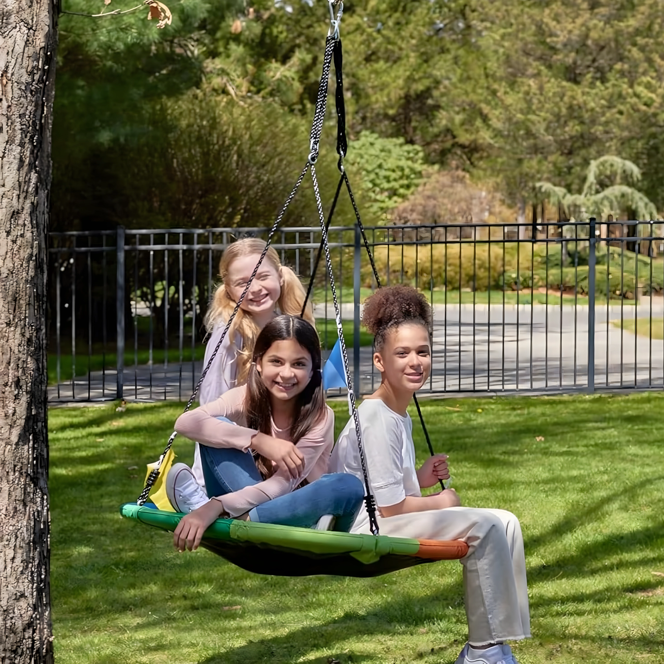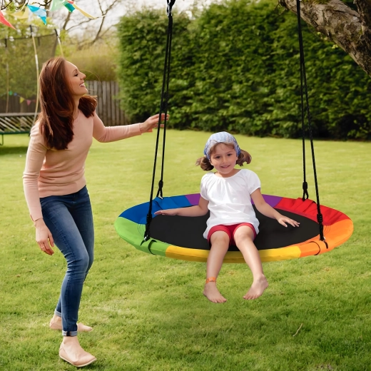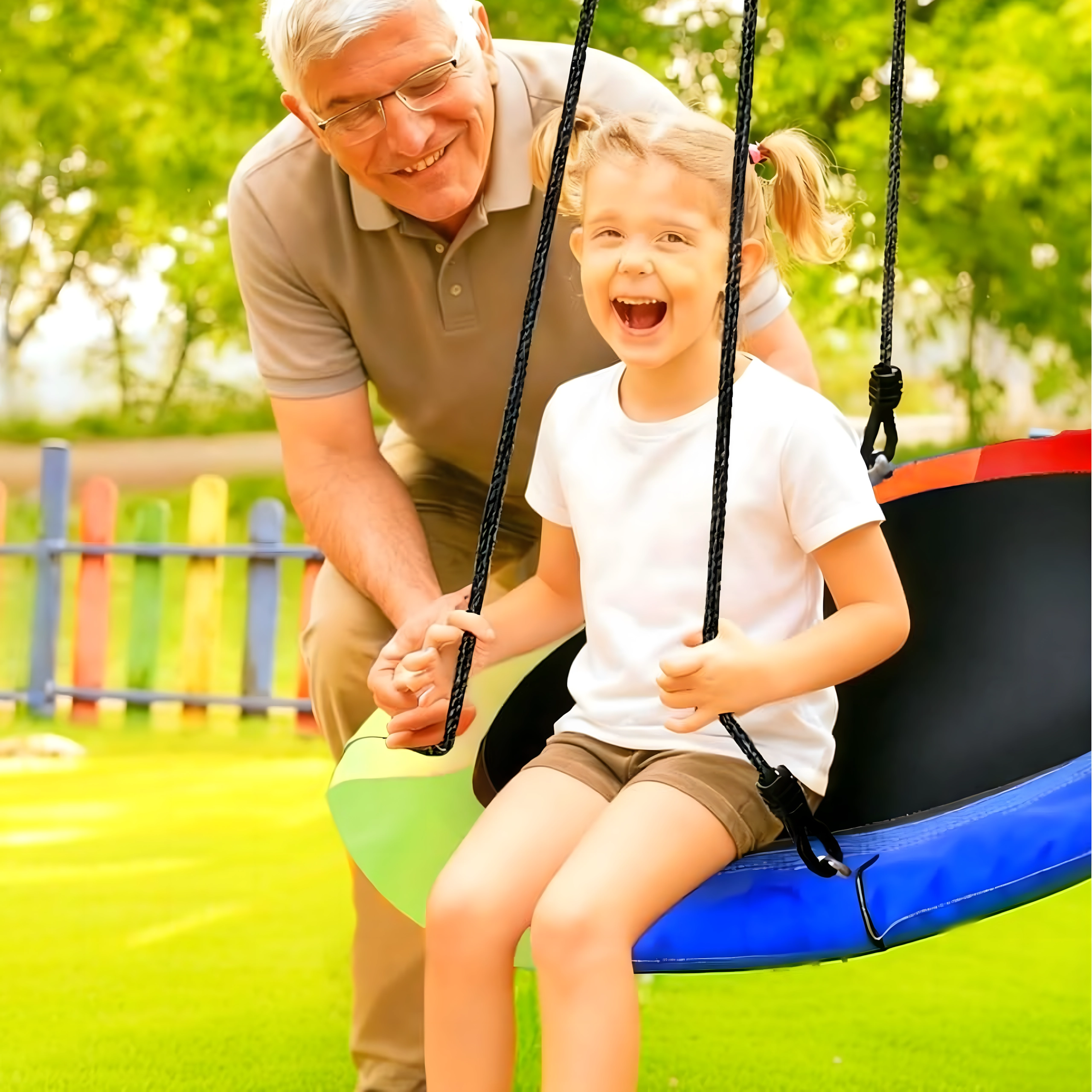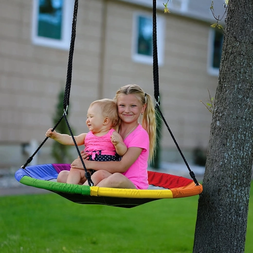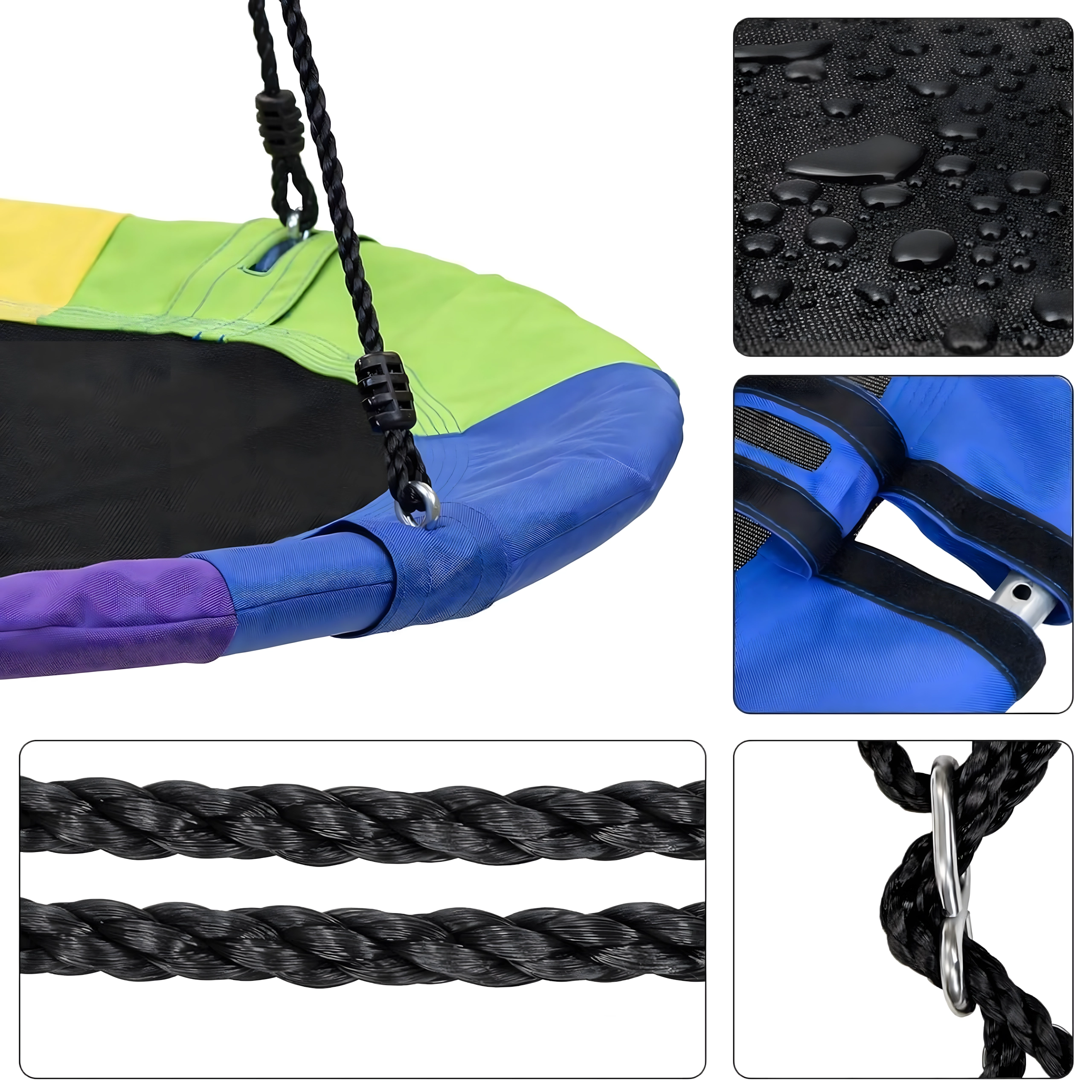Gran columpio redondo tipo nido de cigüeña de 100 cm de diámetro que ofrece a los niños horas de diversión y relax al aire libre. Gracias a su amplio asiento es ideal para sentarse y tumbarse, soporta a varios niños a la vez y cuenta con cuerdas trenzadas resistentes, tejido duradero y mosquetones metálicos para una sujeción segura. El paquete incluye correas para colgar en el árbol y todos los accesorios necesarios.