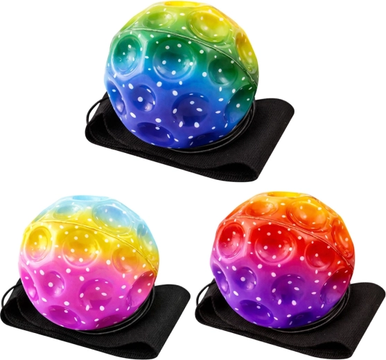 Pelota sensorial antiestrés con cordón elástico y correa para la muñeca que vuelve tras cada lanzamiento o golpe, evitando que los niños tengan que perseguirla. Los colores arcoíris motivan al movimiento y la estructura con hoyuelos masajea agradablemente los dedos, favoreciendo la motricidad fina y la concentración.