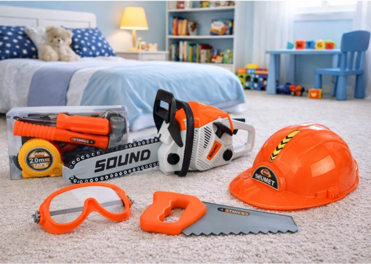 Este conjunto bien pensado permite a los niños imitar a los adultos en trabajos de jardinería y pequeñas reparaciones. La principal atracción es la motosierra de juguete con cadena giratoria, sonidos, arrancador manual y botón de encendido, que imitan fielmente una herramienta real, pero en una versión segura para niños.
