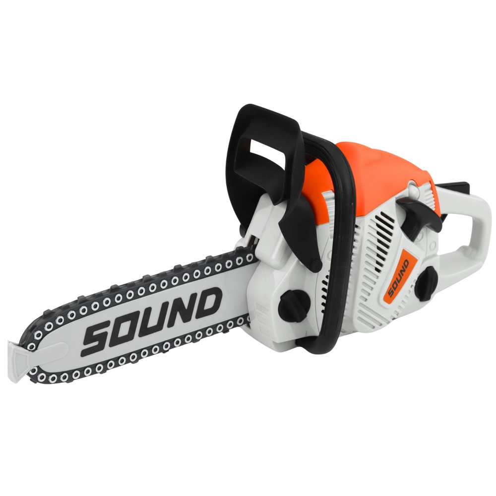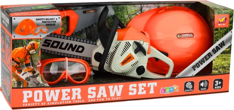 - Motosierra con sonidos, casco, gafas de protección, guantes, sierra manual, juego de herramientas