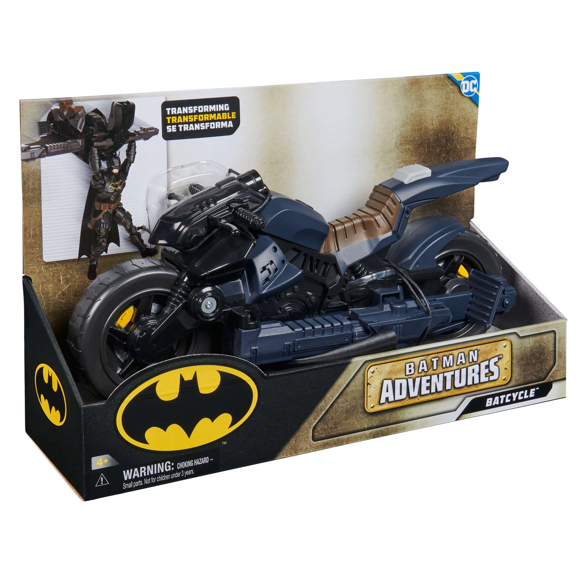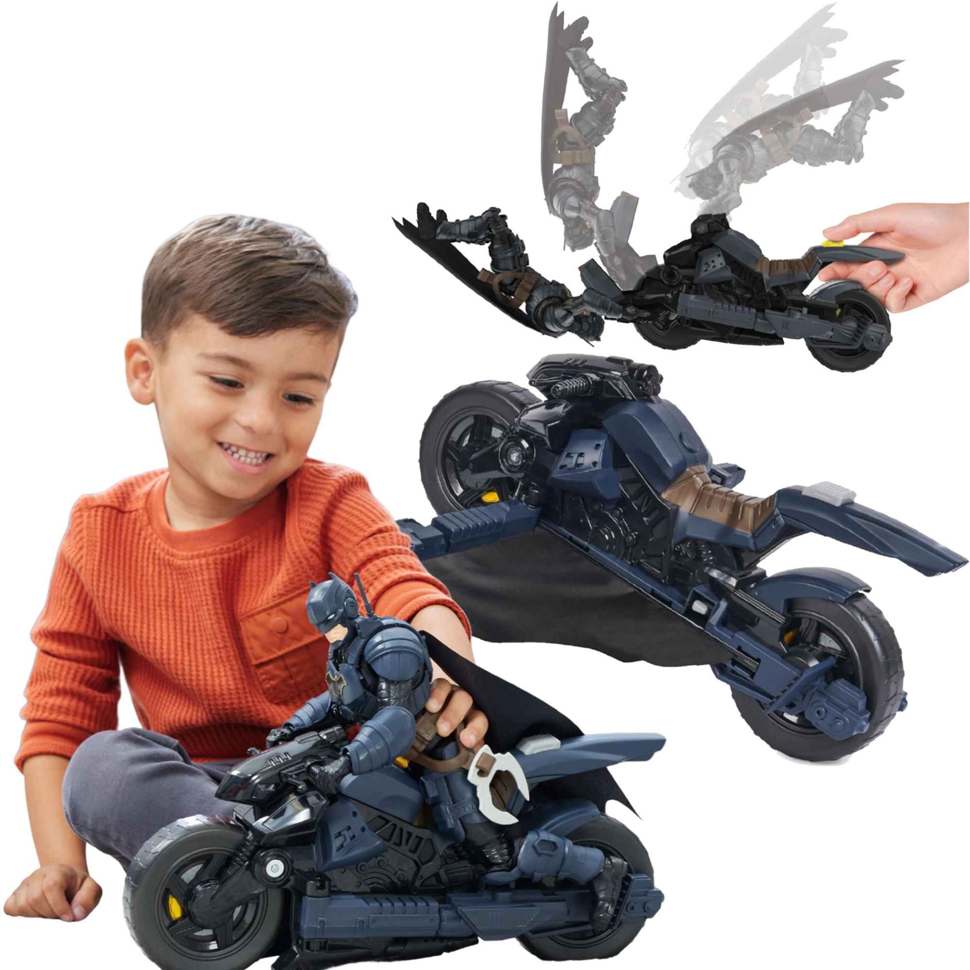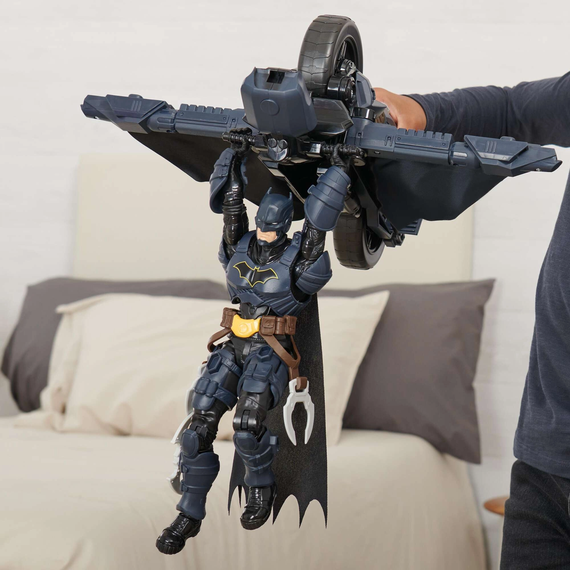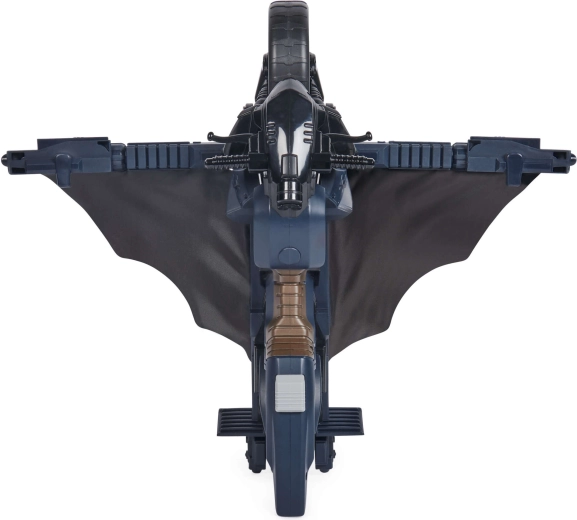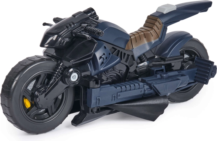 La Batcycle ofrece a los niños auténtica acción de superhéroes. La motocicleta proporciona un asiento estable para la figura y una sujeción firme al manillar, de modo que la conducción y el “vuelo” son suaves y seguros. Al pulsar el botón detrás del asiento, el vehículo se transforma en un planeador con alas, ampliando las posibilidades de juego desde persecuciones hasta aterrizajes audaces.