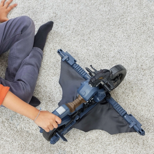 Pulsa el botón detrás del asiento y observa cómo la Batcycle se convierte al instante en un planeador con alas para misiones audaces sobre Gotham.