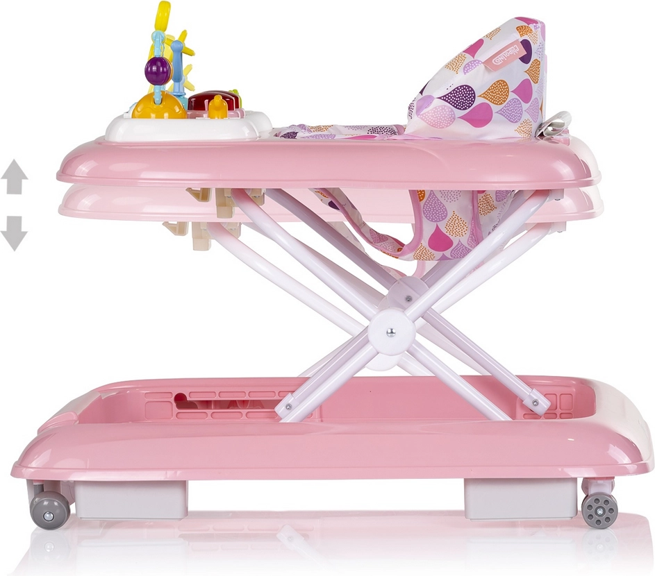 El panel de juego interactivo con luces, botones y 12 melodías motiva a la actividad y favorece la percepción sensorial y la motricidad fina. El asiento con respaldo alto garantiza una postura correcta y comodidad; la altura se ajusta fácilmente en tres posiciones. El andador se pliega con facilidad para ahorrar espacio y facilitar su transporte.