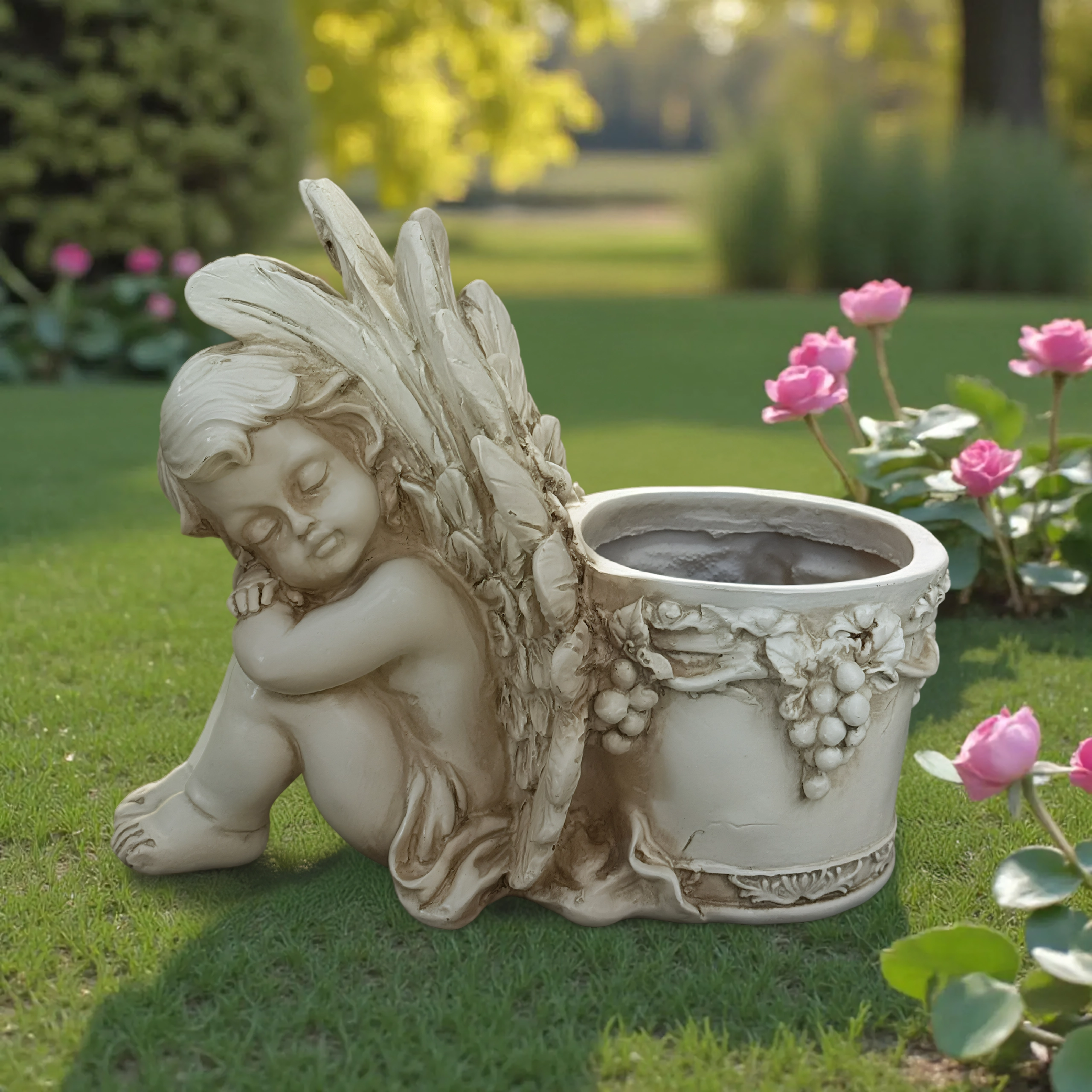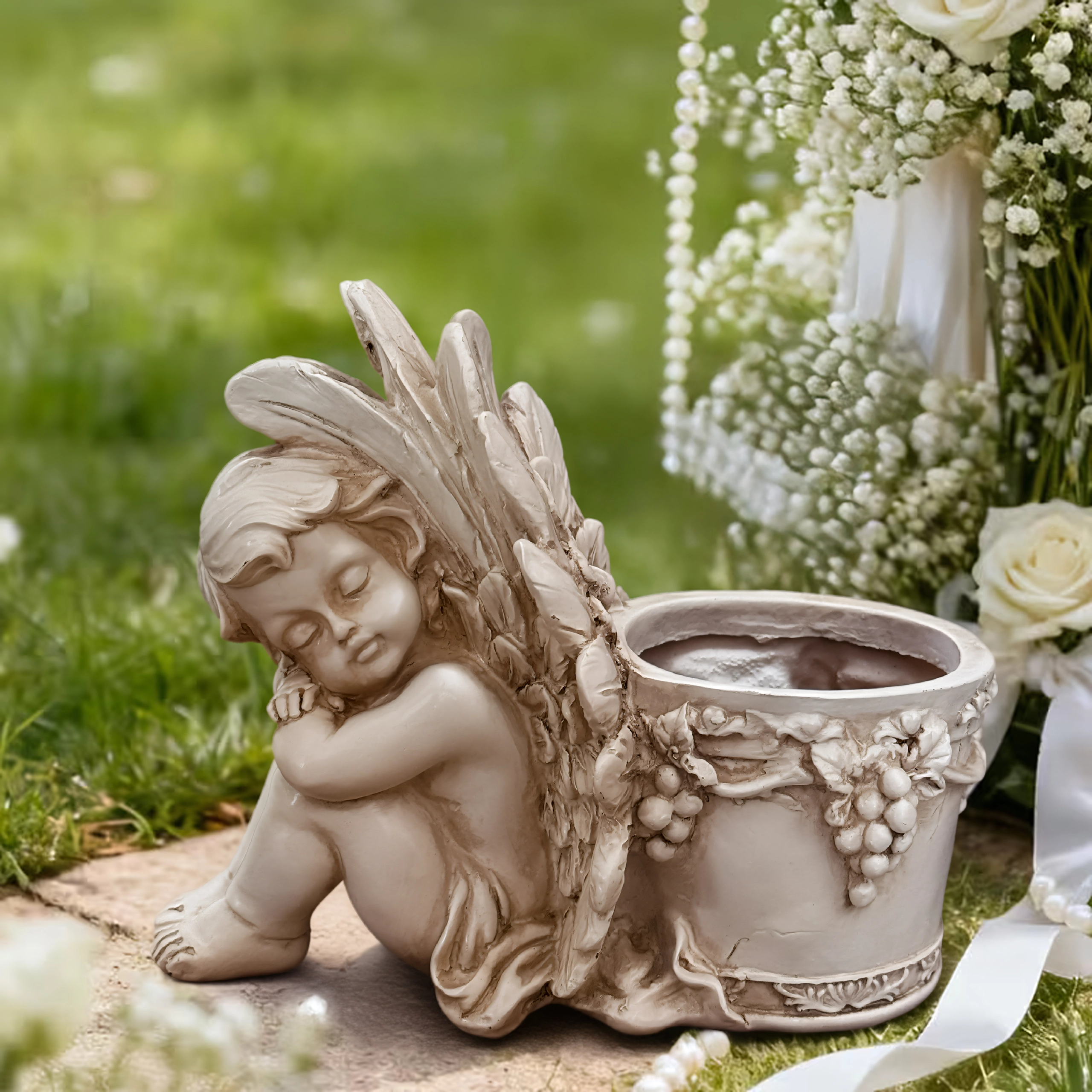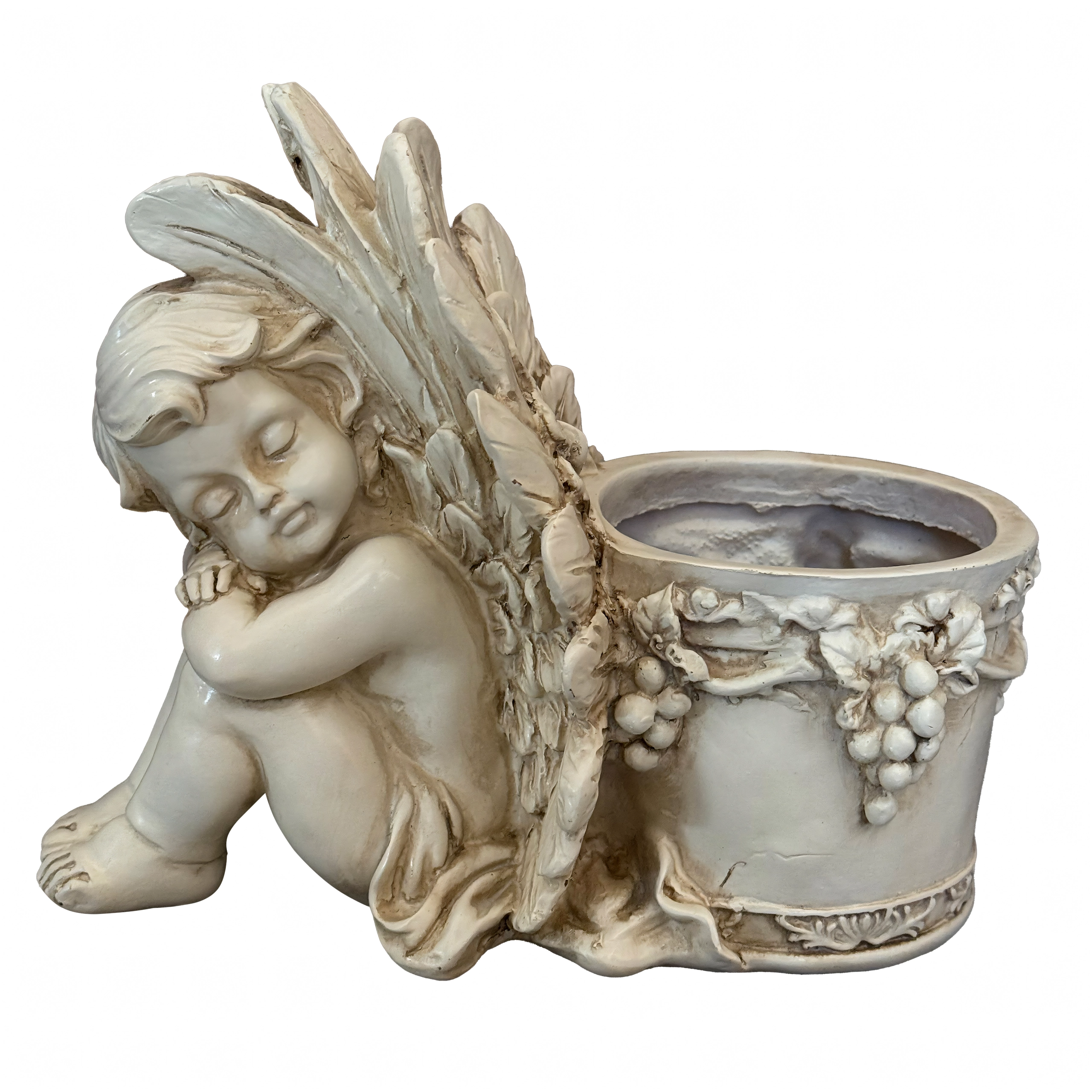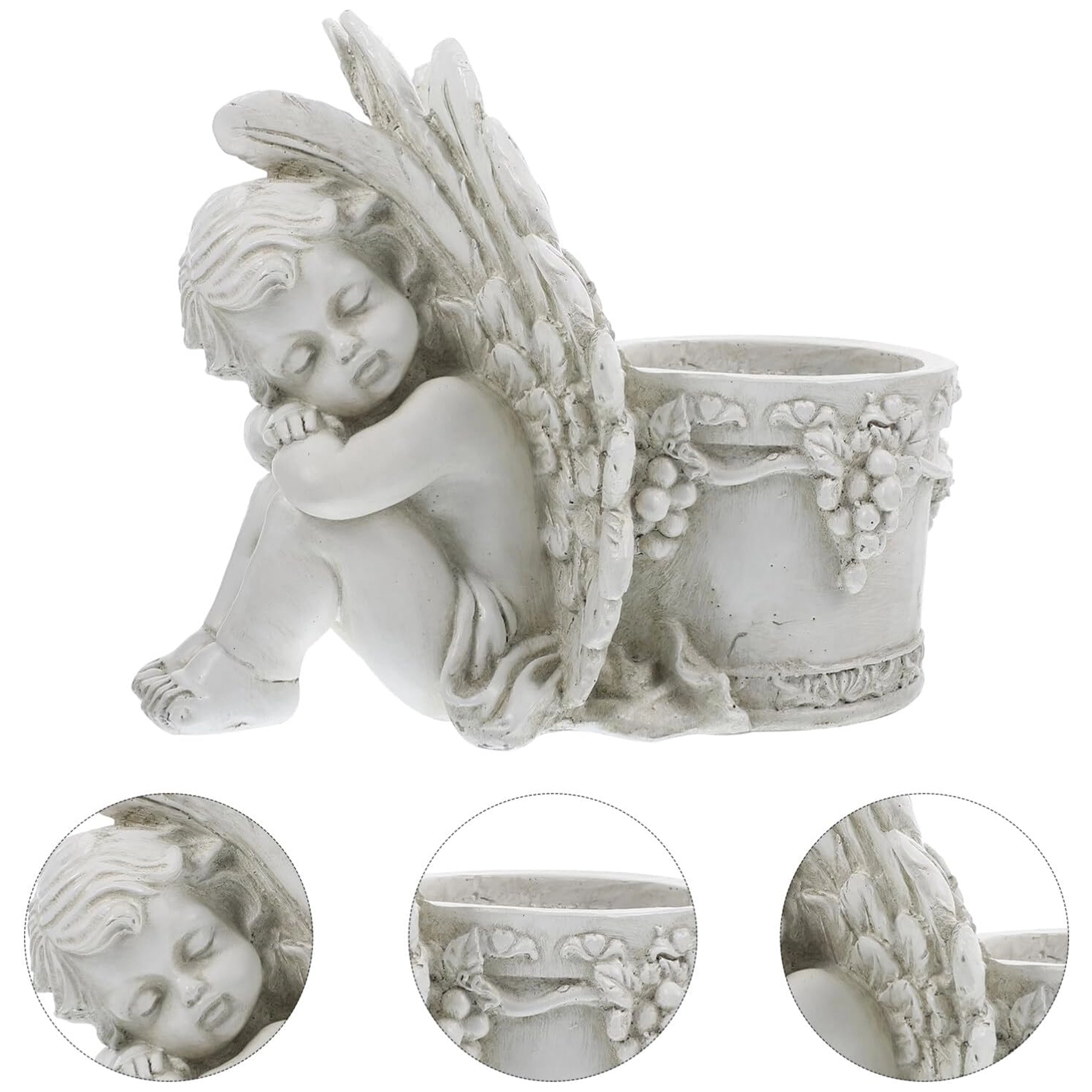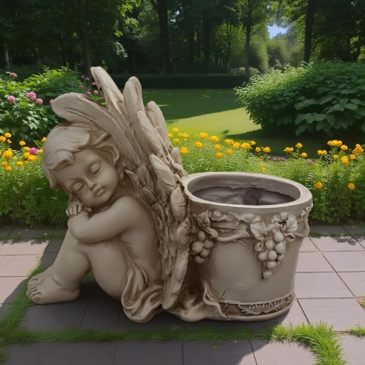 Este estiloso macetero con la figura de un angelito dormido combina el encanto de la decoración con la funcionalidad de un recipiente para plantas. El cuerpo del ángel, con alas finamente trabajadas, se apoya en un macetero redondo adornado con motivos de vid que realzan su aspecto antiguo de piedra. Es perfecto para interior y exterior: en el alféizar, el balcón, la terraza o un rincón del jardín.