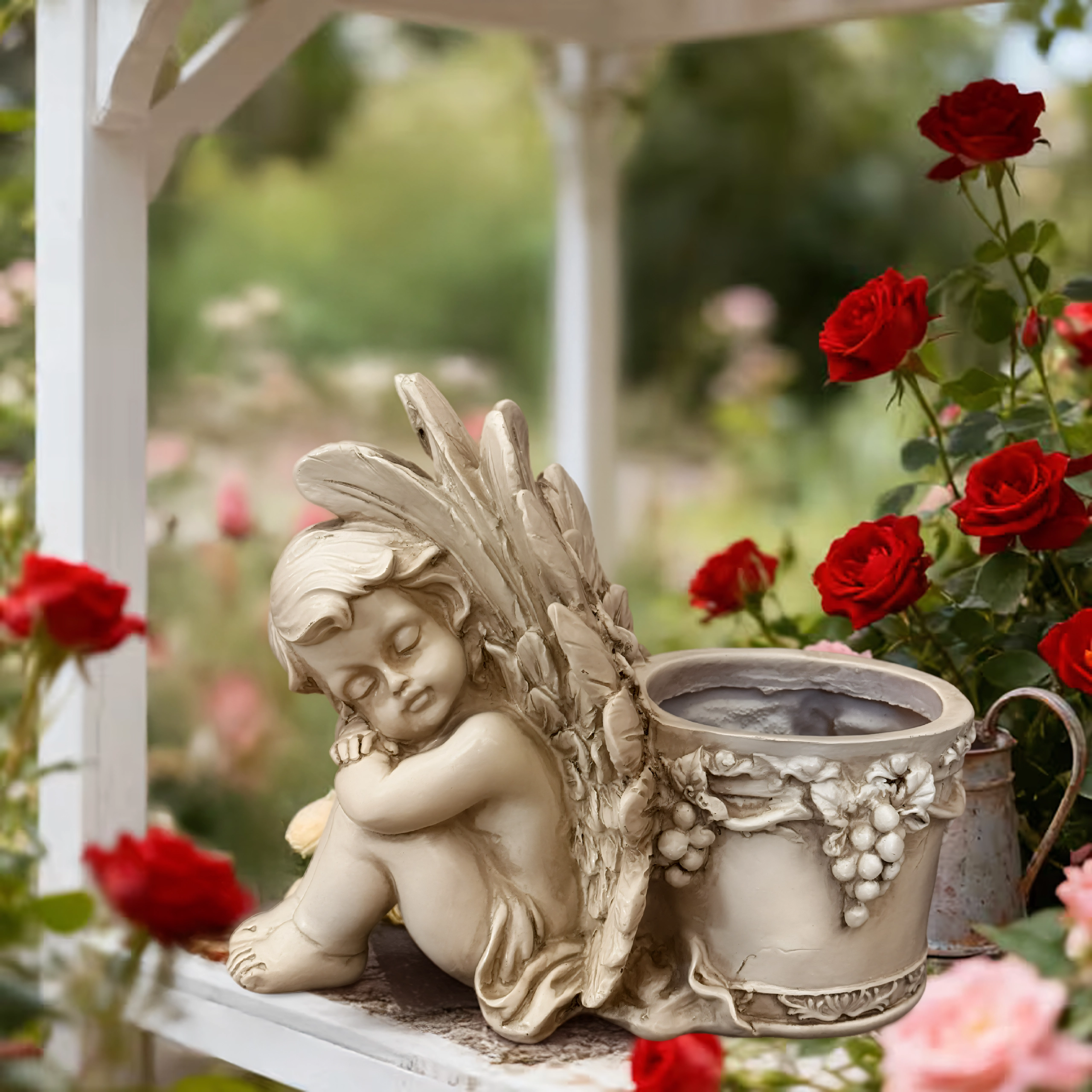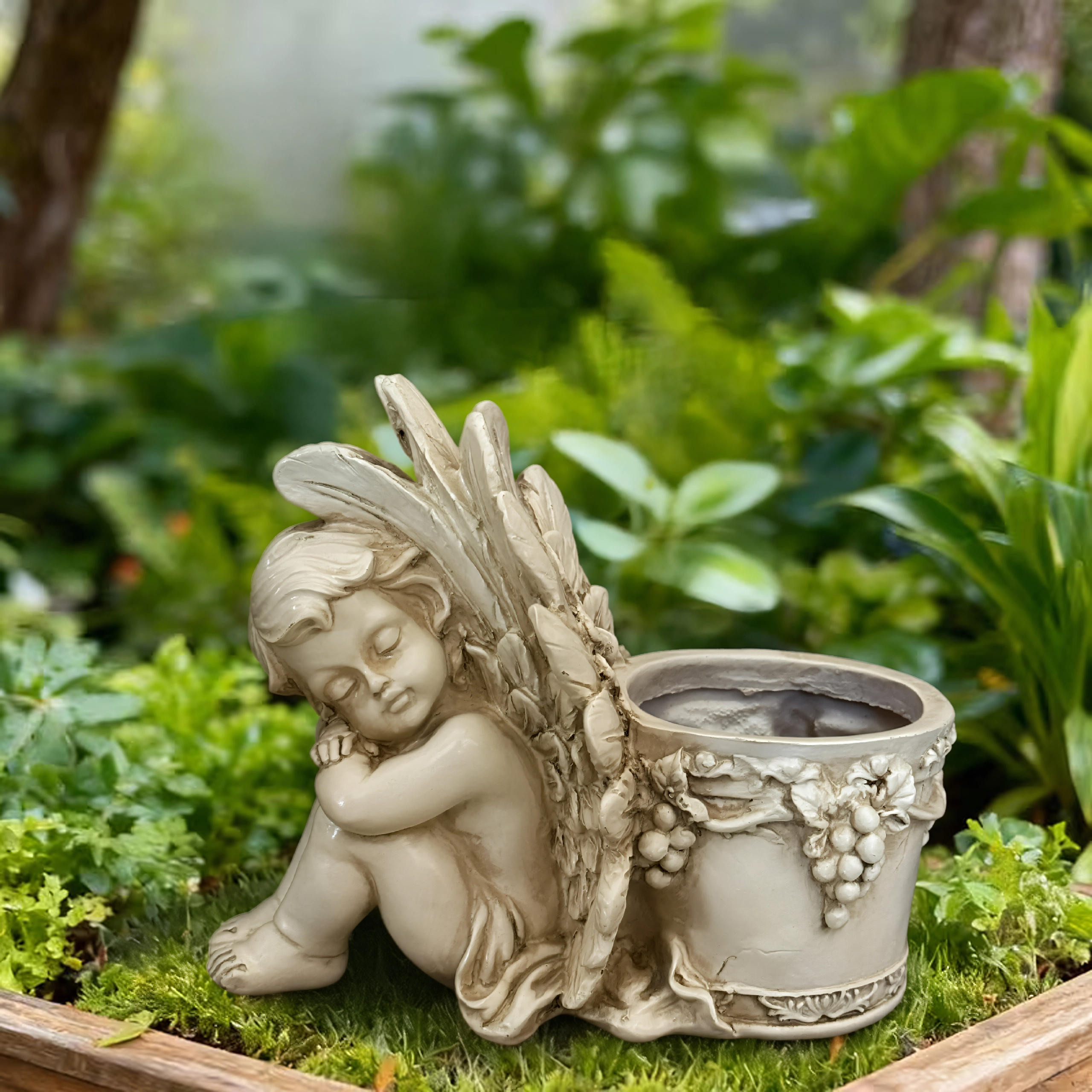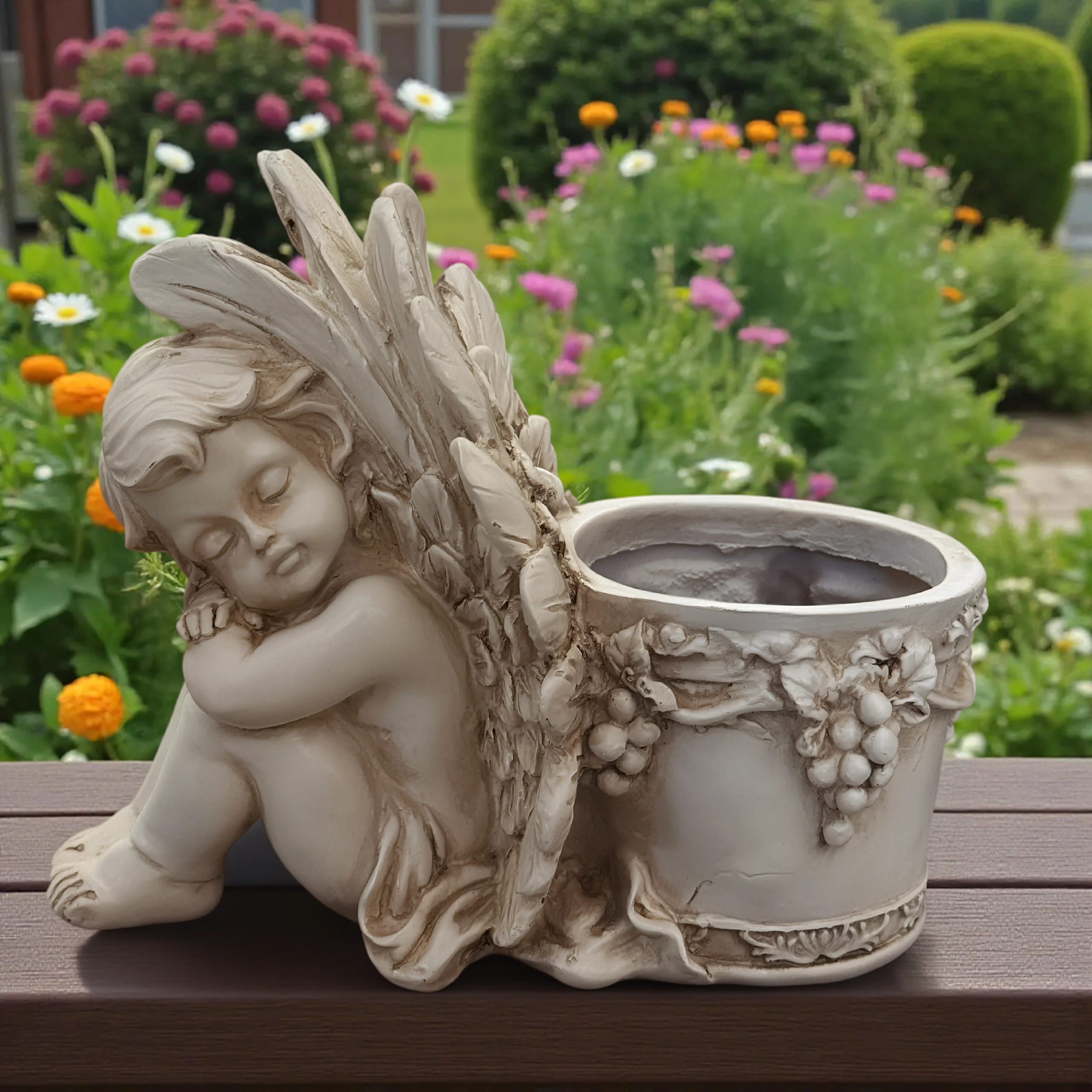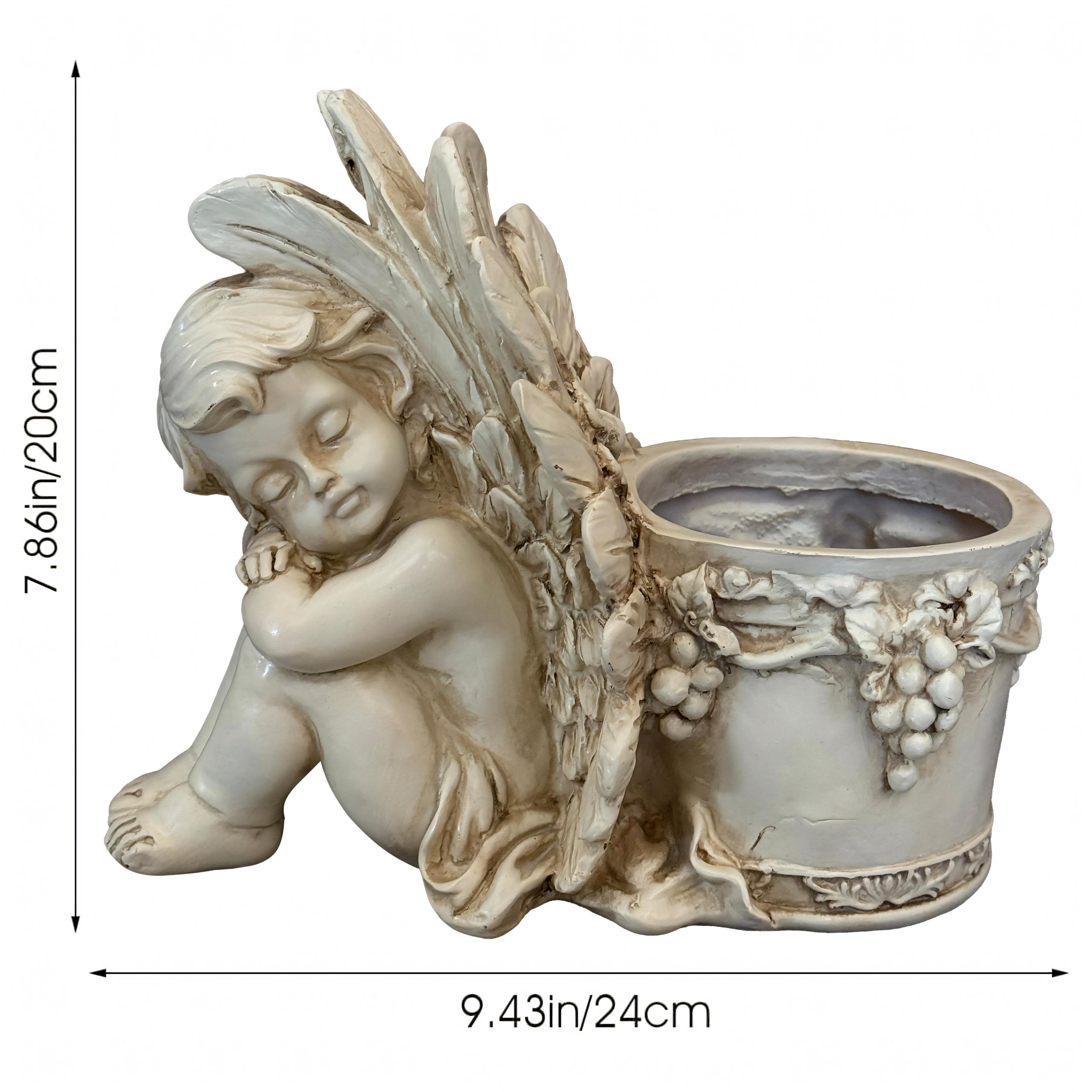 Este estiloso macetero con la figura de un angelito dormido combina el encanto de la decoración con la funcionalidad de un recipiente para plantas. El cuerpo del ángel, con alas finamente trabajadas, se apoya en un macetero redondo adornado con motivos de vid que realzan su aspecto antiguo de piedra. Es perfecto para interior y exterior: en el alféizar, el balcón, la terraza o un rincón del jardín.