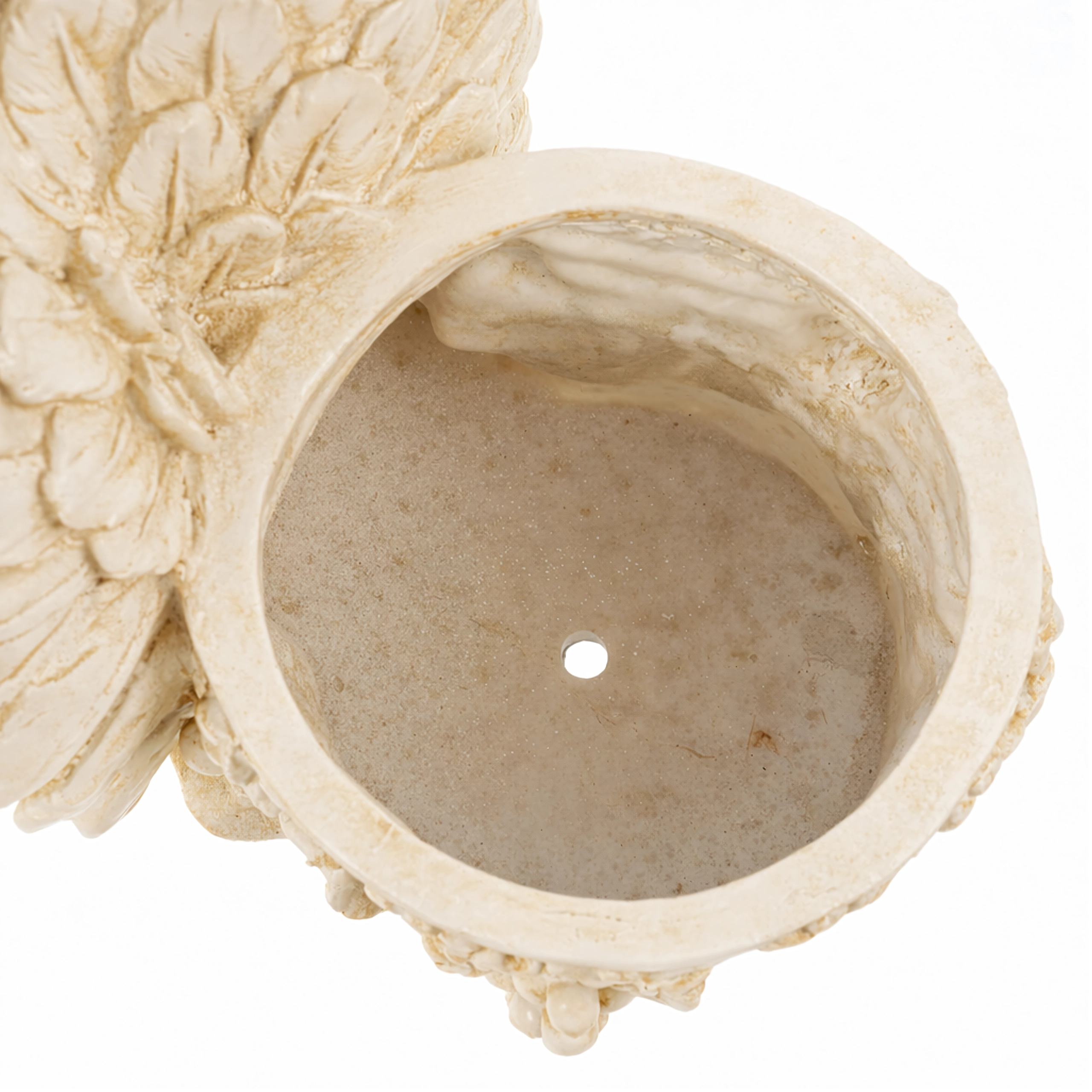 Los detalles precisos de las alas, el cabello y los motivos de hojas aportan a la decoración un carácter auténtico de piedra que destaca en cualquier composición.