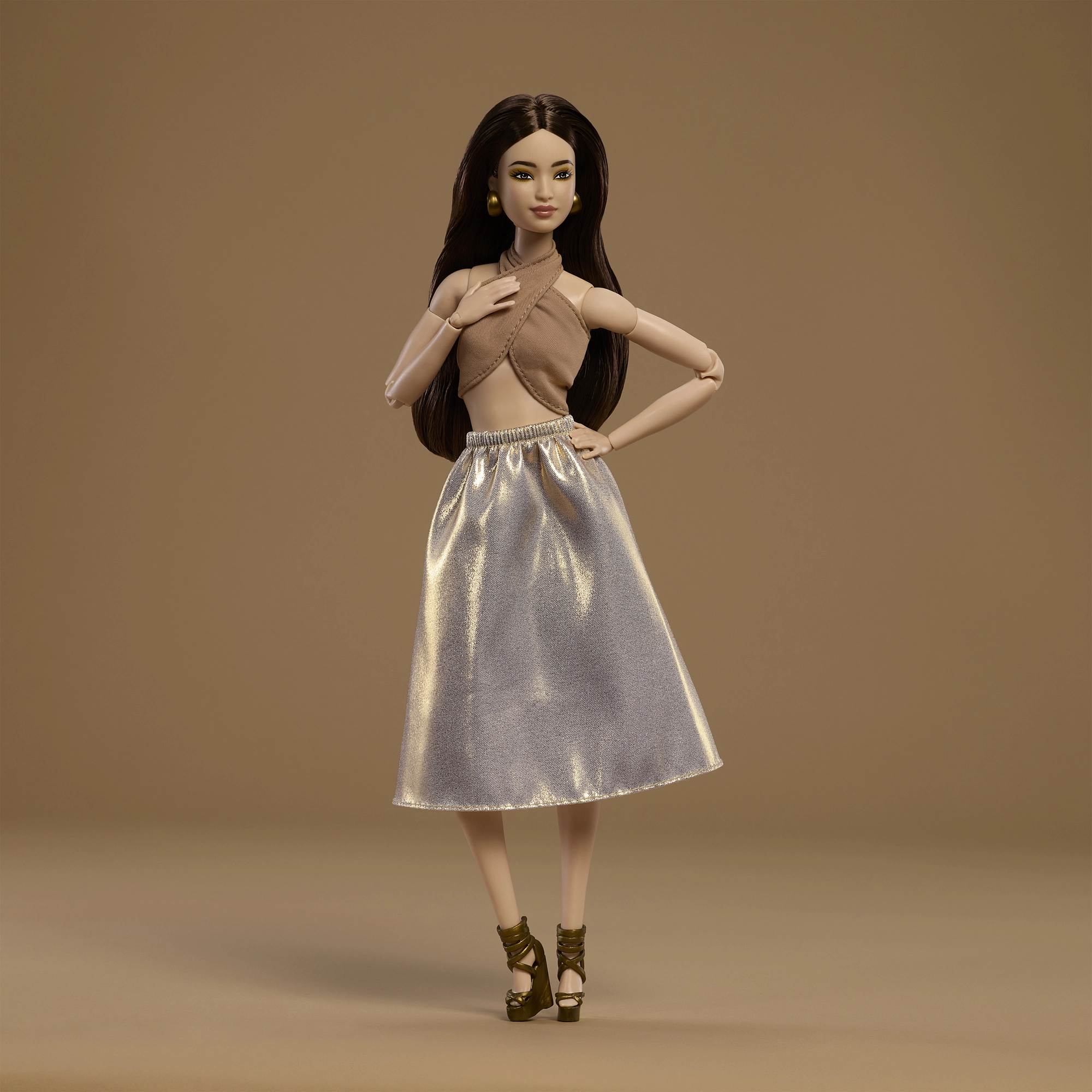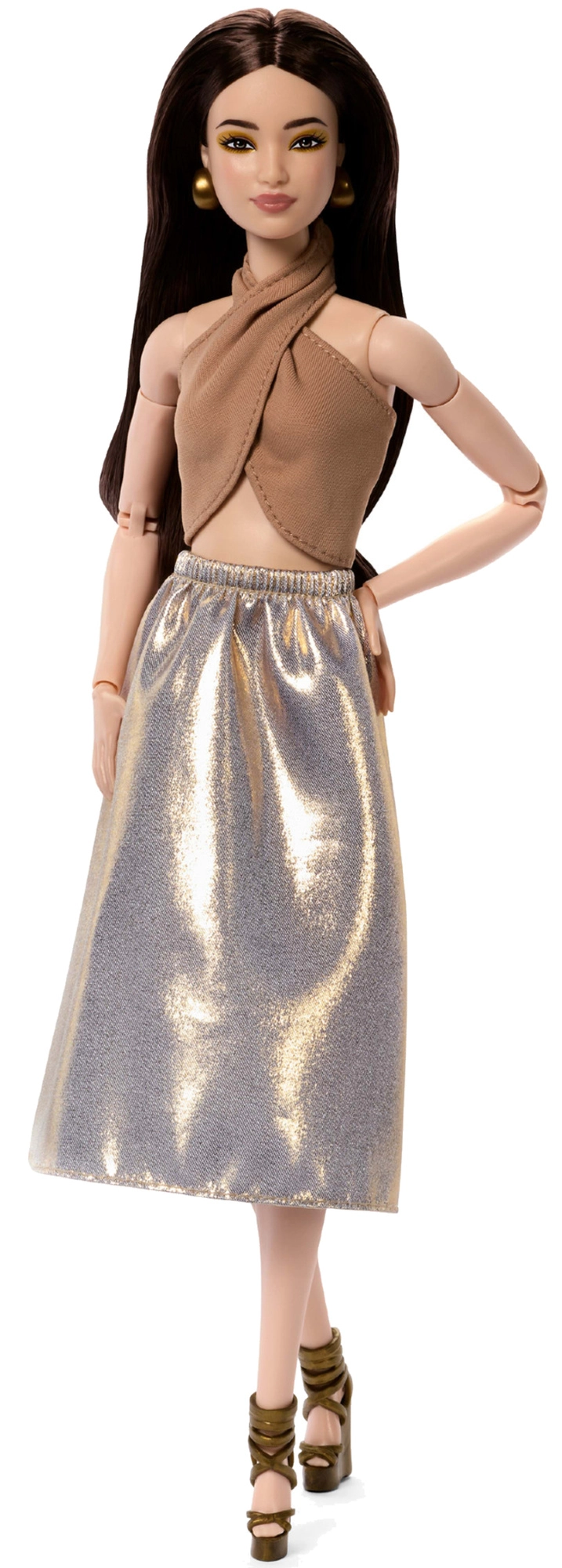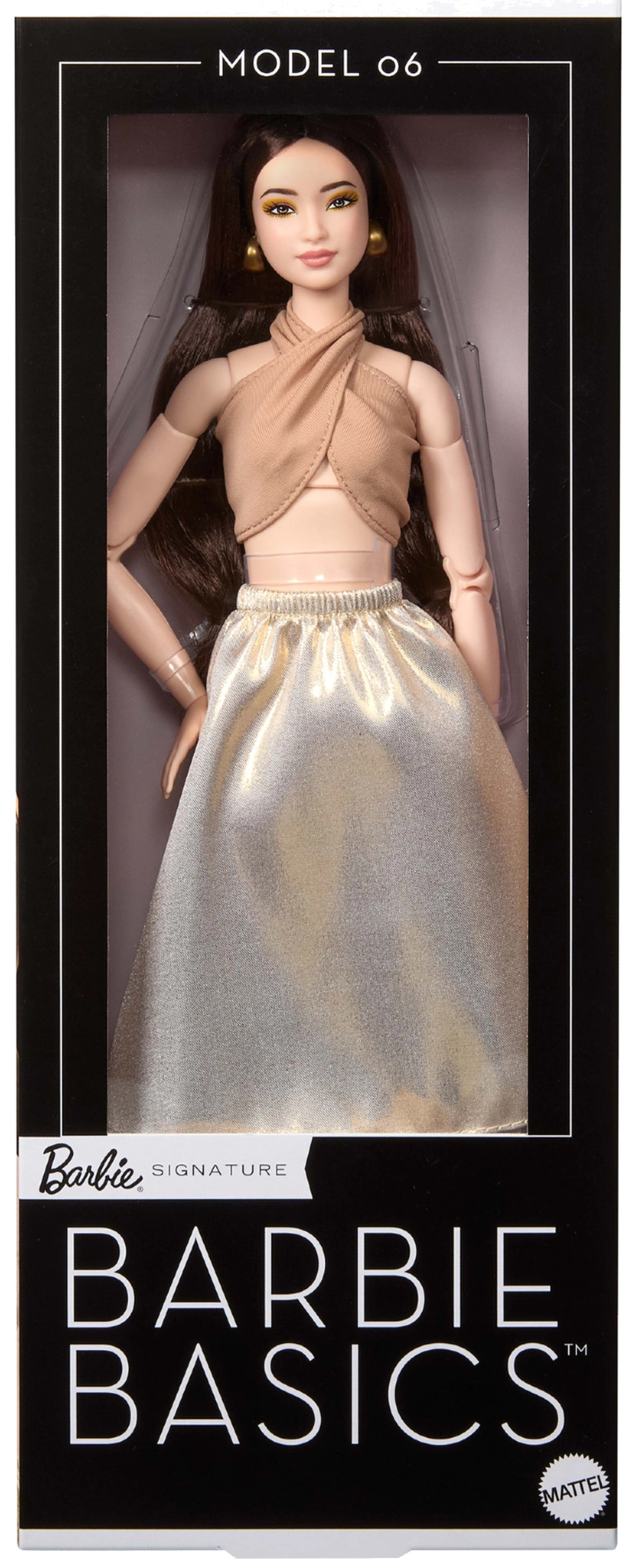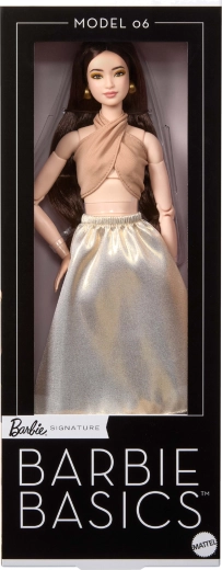 El modelo 06 de la serie Barbie Signature Basics aporta una elegancia minimalista en tonos de marrón claro y dorado. La combinación de un top elegante y una falda fluida realza un look moderno y atemporal. La muñeca tiene tez clara, figura esbelta y un maquillaje armónico y discreto que resalta su belleza natural.