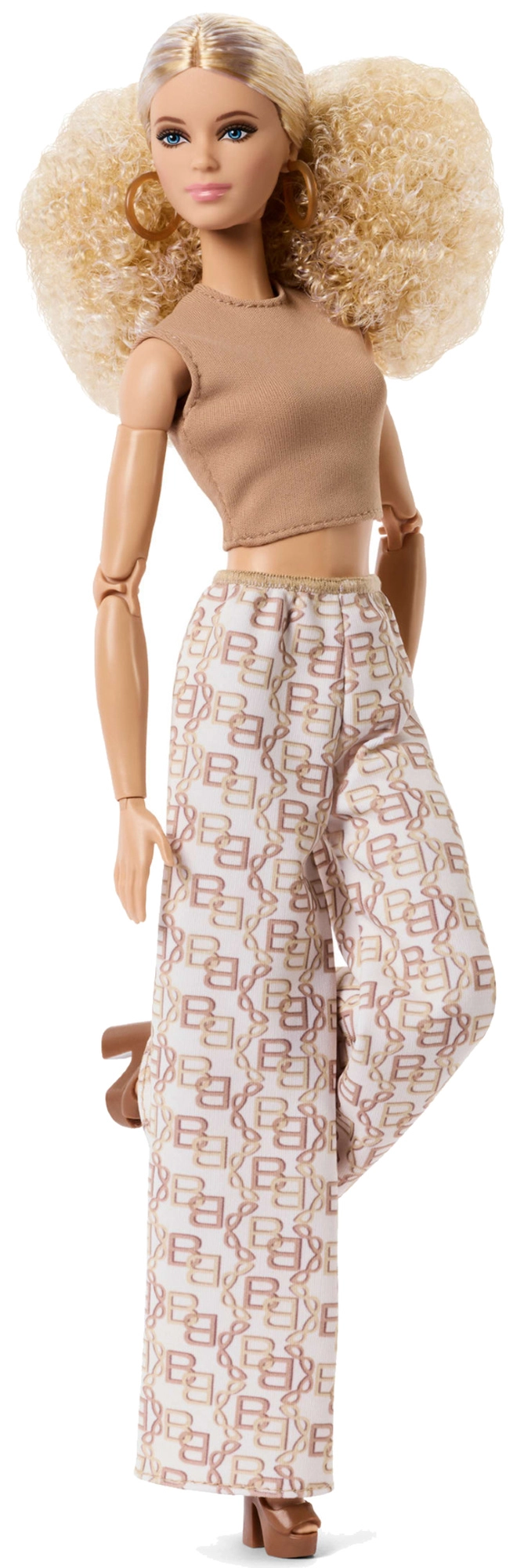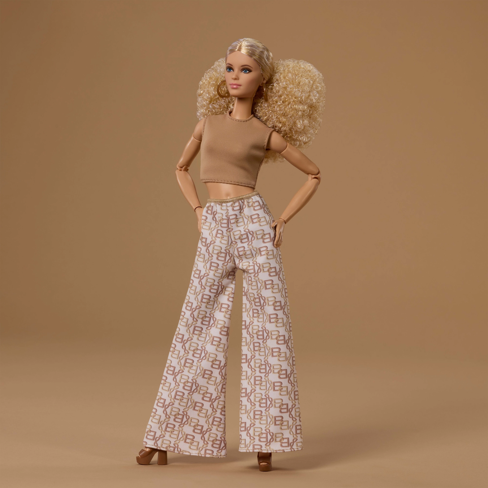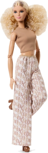 El estilo se inclina hacia tonos neutros y atemporales: marrón claro, blanco y dorado. La muñeca lleva un top elegante y pantalones largos y anchos que combinan perfectamente con otros accesorios BARBIE. Gracias a su altura estándar de aprox. 29 cm, es compatible con la mayoría de accesorios y mobiliario BARBIE.