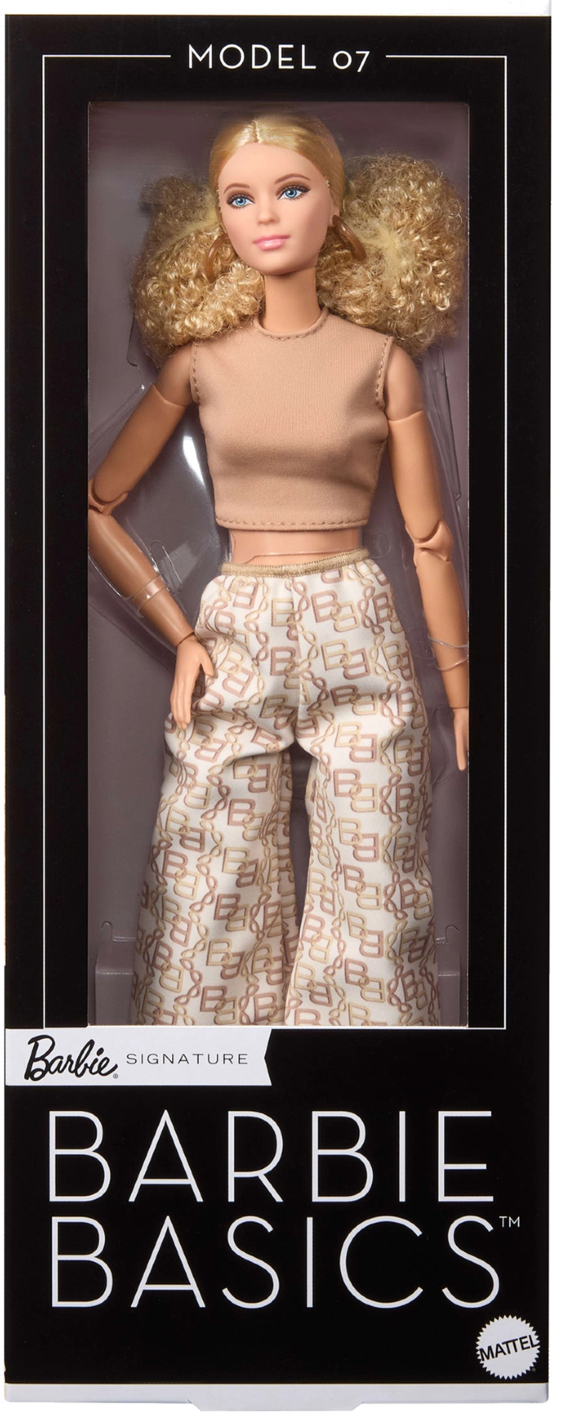 La muñeca BARBIE Signature Basics Modelo 07 celebra el minimalismo y la elegancia moderna. Su rostro delicado con ojos azules, maquillaje sutil y tez clara realza su belleza clásica. El cabello rubio rizado está peinado en un estilo sencillo que combina con la estética limpia de toda la serie.