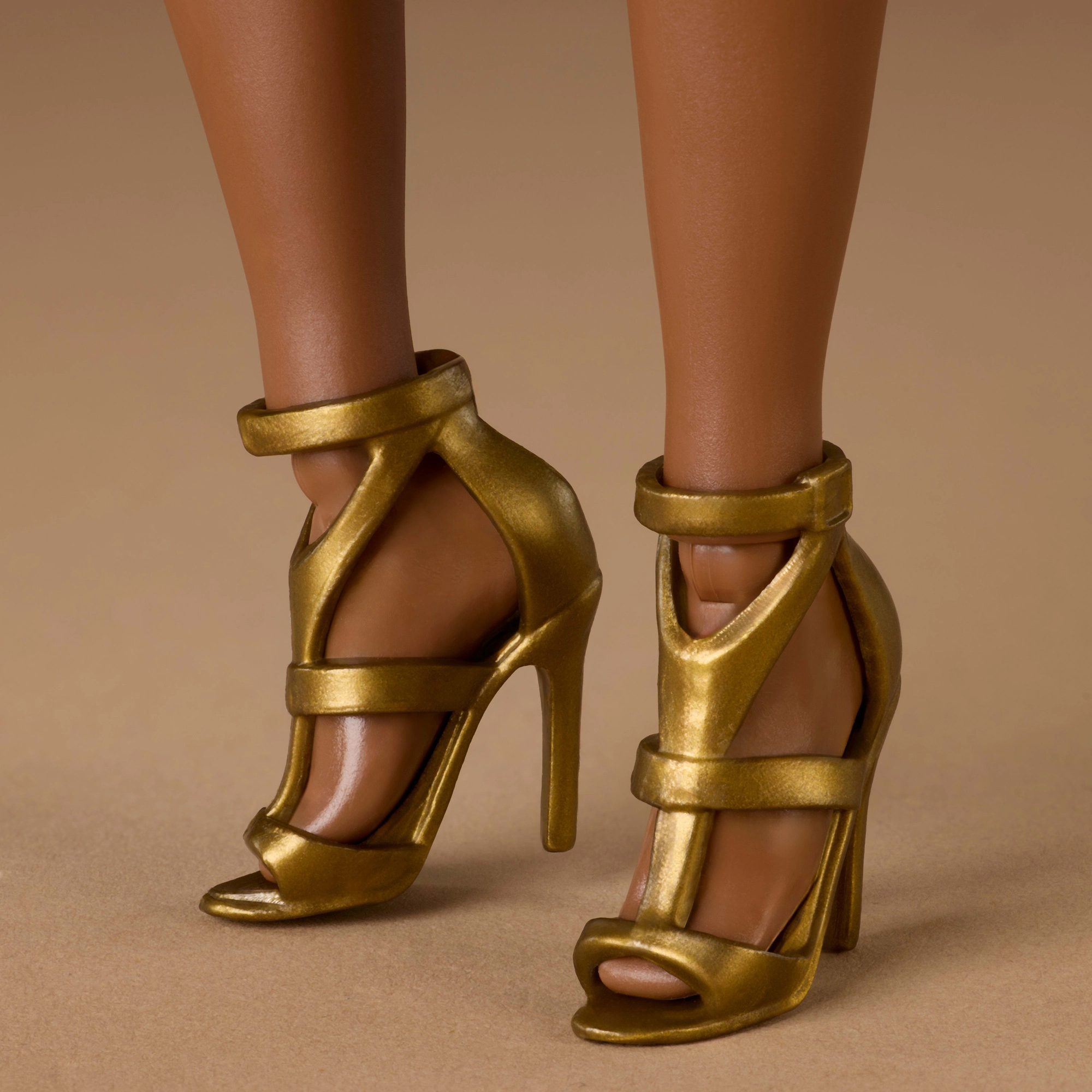El estilo se centra en tonos neutros y atemporales con acentos dorados: un vestido dorado brillante se complementa con maquillaje discreto y detalles delicados. La muñeca es compatible con accesorios BARBIE y encaja perfectamente en conjuntos creativos y mezcla de estilos.