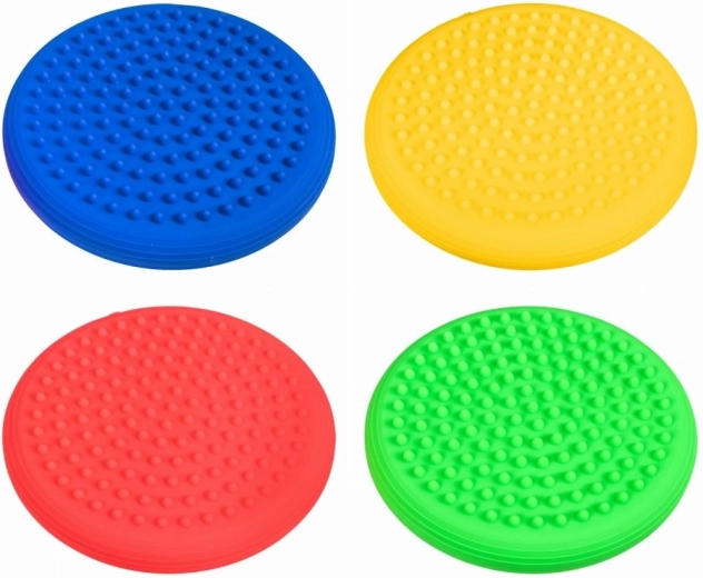 Los discos están fabricados con un material resistente y flexible, agradable al tacto y capaz de soportar el uso diario. La seguridad es lo primero: el producto es sin ftalatos, BPA ni metales pesados y cumple con CE. Son ideales para juegos infantiles, en ergoterapia y fisioterapia, y como alfombrillas de masaje para estimular la planta del pie.