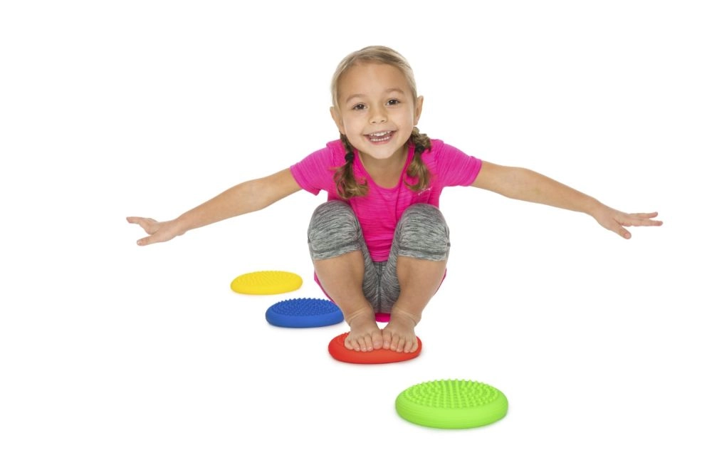 Los discos de colores motivan a los niños a moverse, desarrollan la coordinación, la propiocepción y fortalecen el sistema estabilizador profundo.
