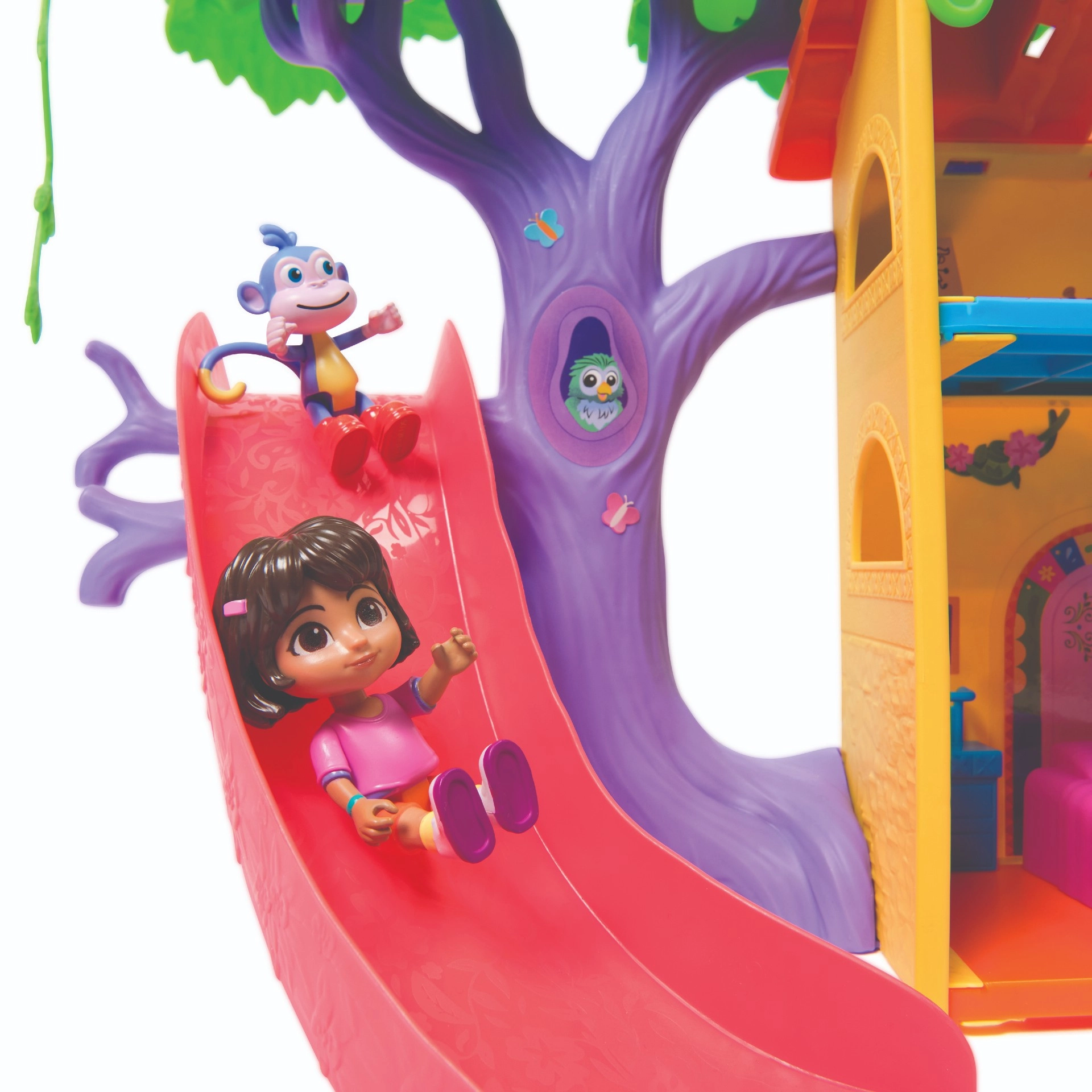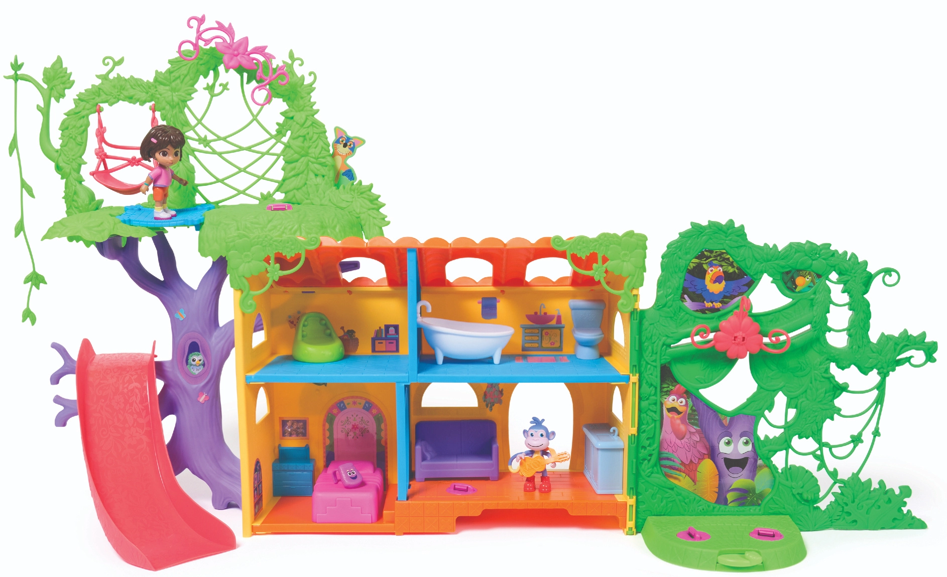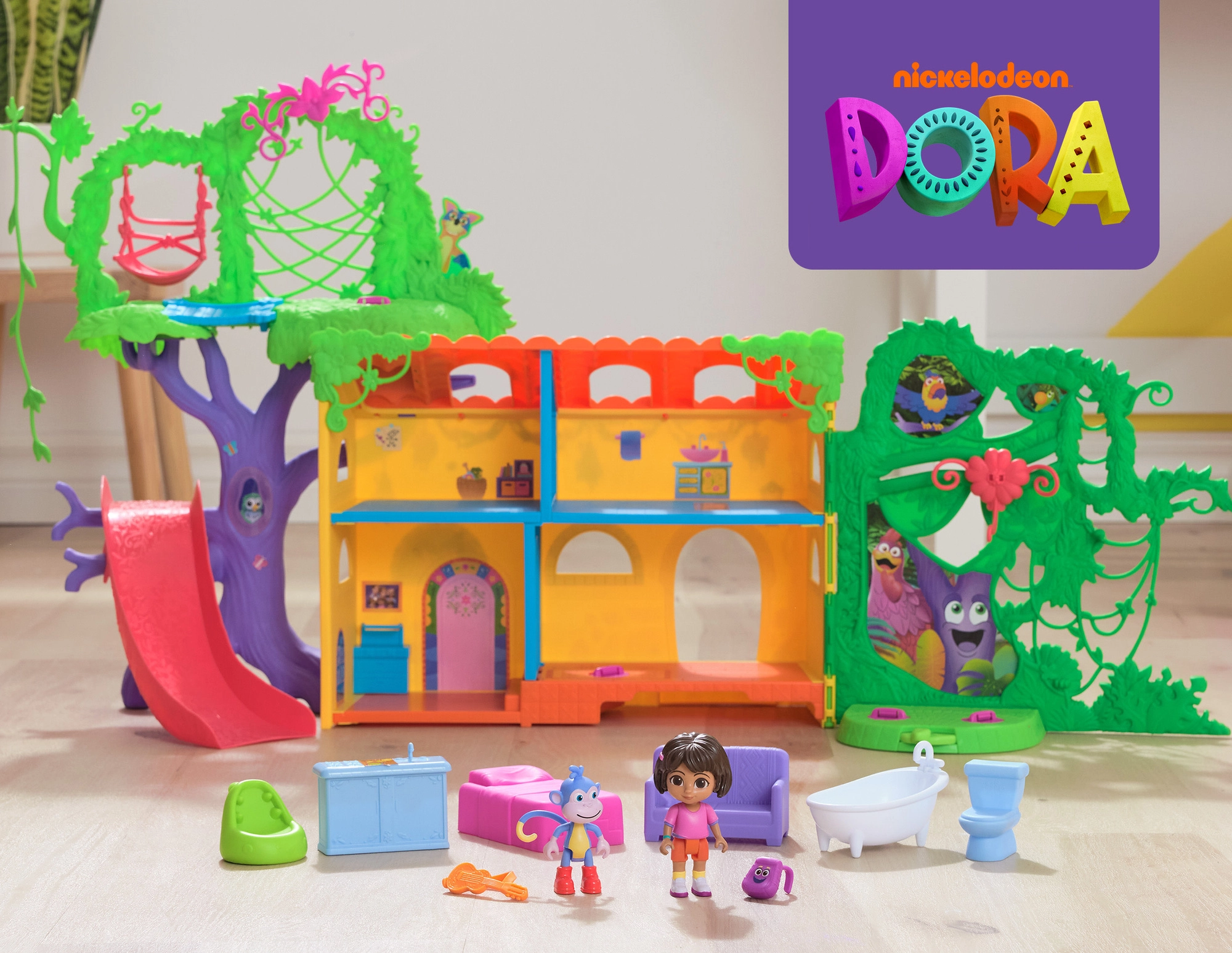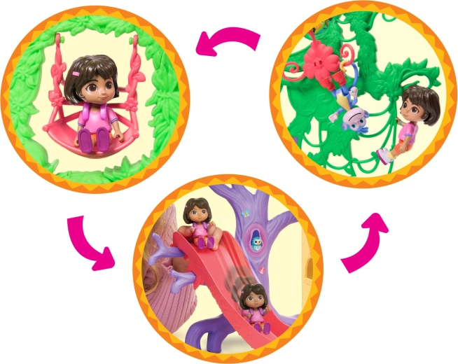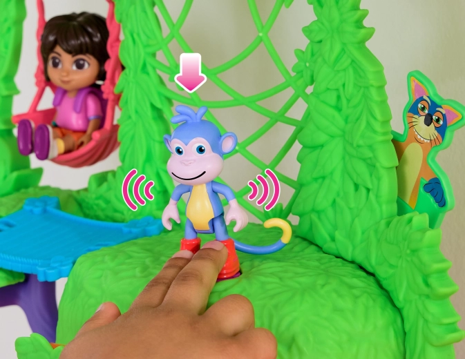 Entra en la colorida casita de la jungla inspirada en la serie Dora la Exploradora y lánzate a la aventura. El interior ofrece varias habitaciones detalladas con muebles (p. ej., sofá, bañera), mientras que el exterior rebosa de atracciones en las copas de los árboles. Con solo presionar el botón del salón activarás efectos de sonido y música que potencian el aprendizaje interactivo y la diversión.