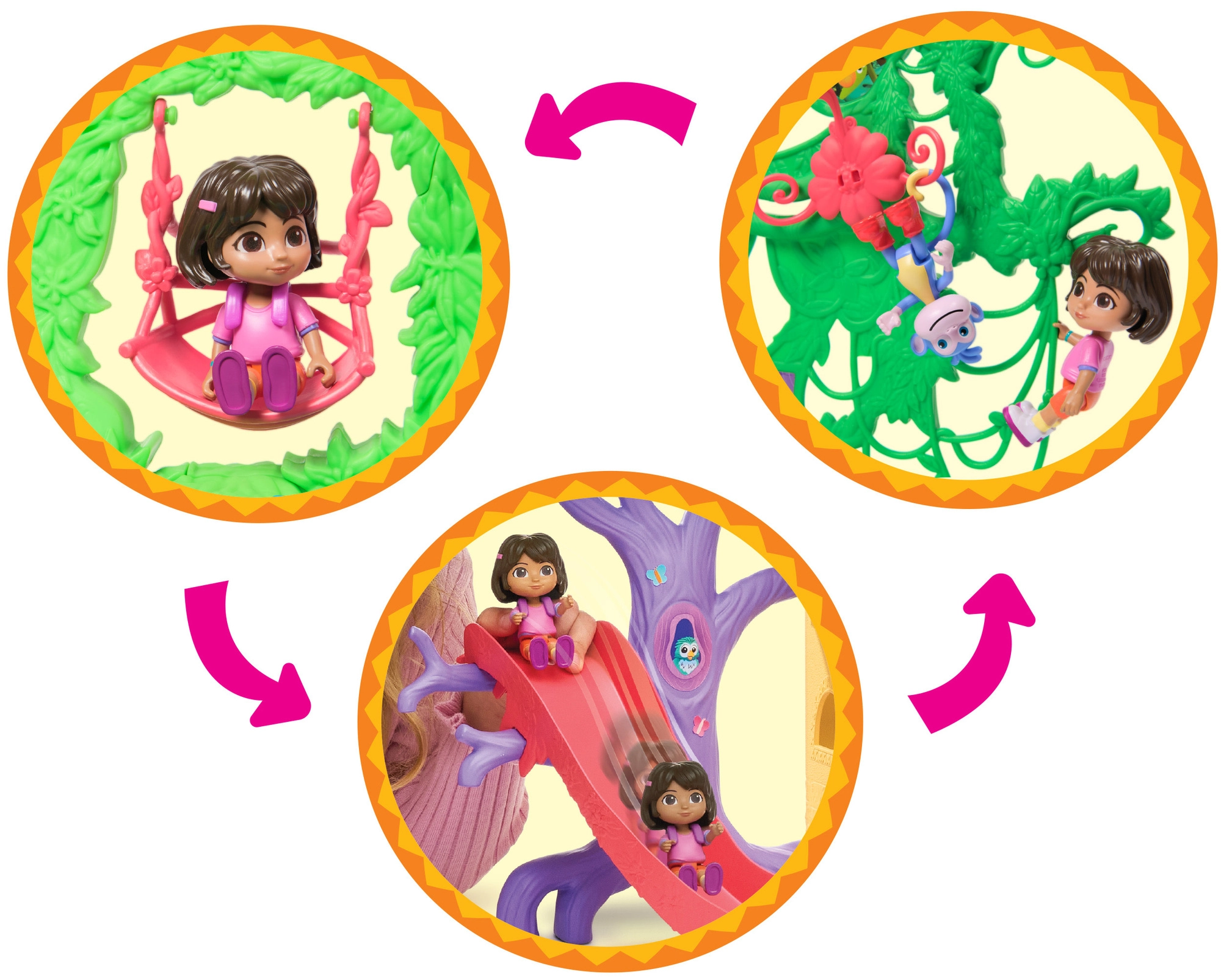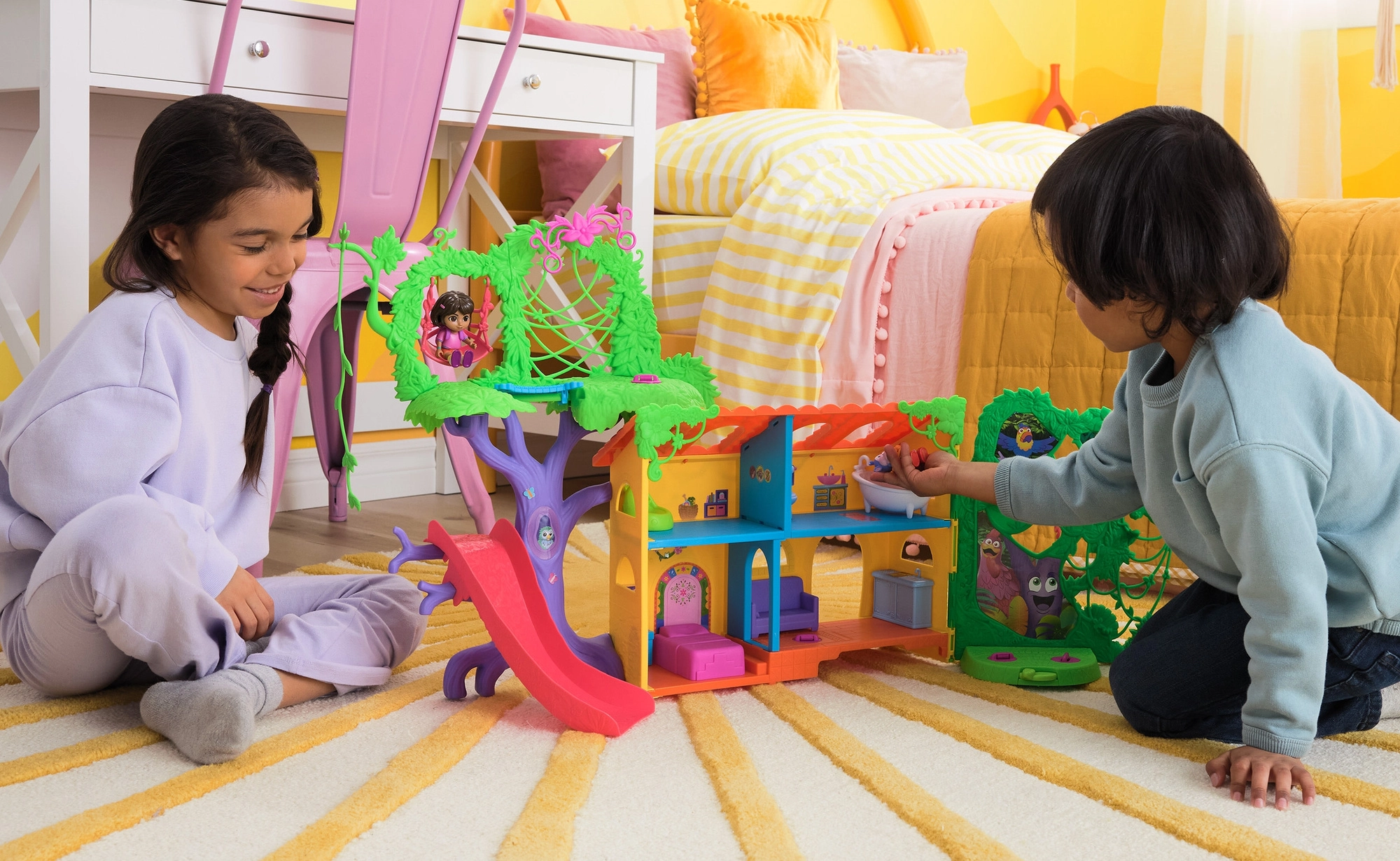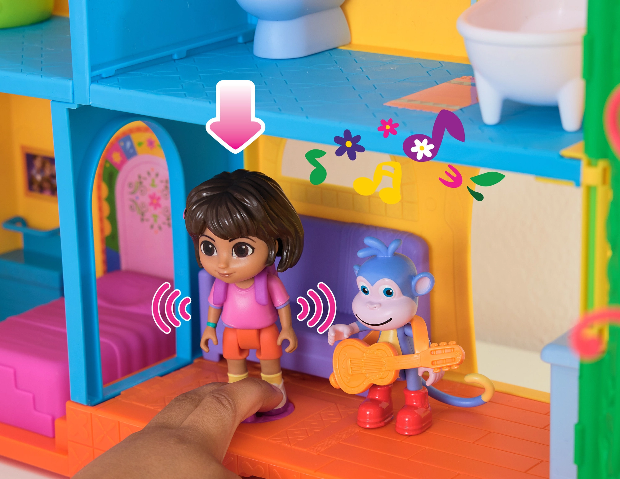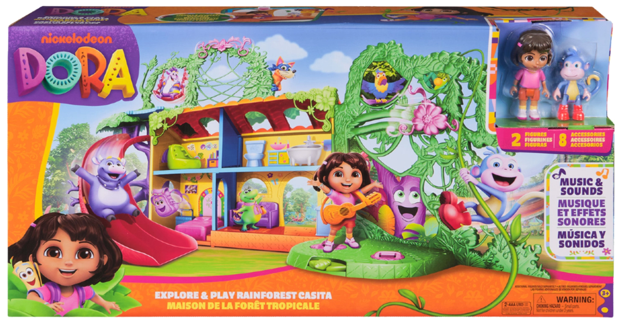 Entra en la colorida casita de la jungla inspirada en la serie Dora la Exploradora y lánzate a la aventura. El interior ofrece varias habitaciones detalladas con muebles (p. ej., sofá, bañera), mientras que el exterior rebosa de atracciones en las copas de los árboles. Con solo presionar el botón del salón activarás efectos de sonido y música que potencian el aprendizaje interactivo y la diversión.