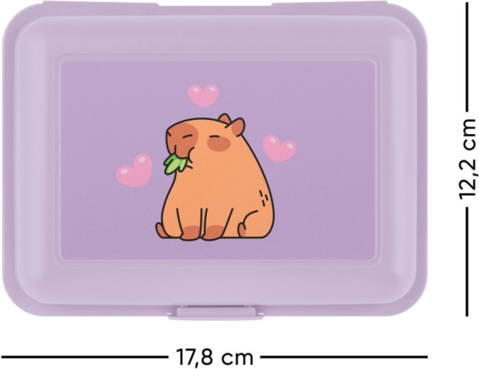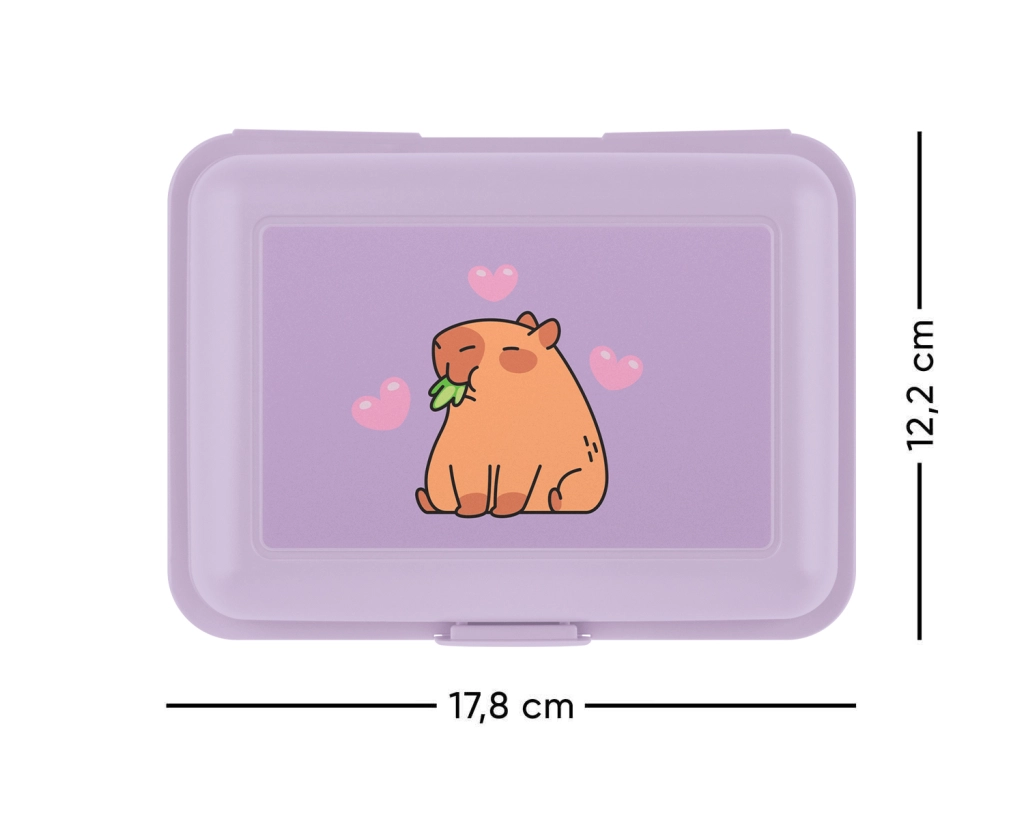 Práctica y resistente caja para almuerzo en elegante color morado con motivo de Capibara. Gracias al cierre sencillo con un solo clip y al separador interior, mantiene los alimentos ordenados, separados y frescos. Una gran opción para la escuela, excursiones y uso diario.