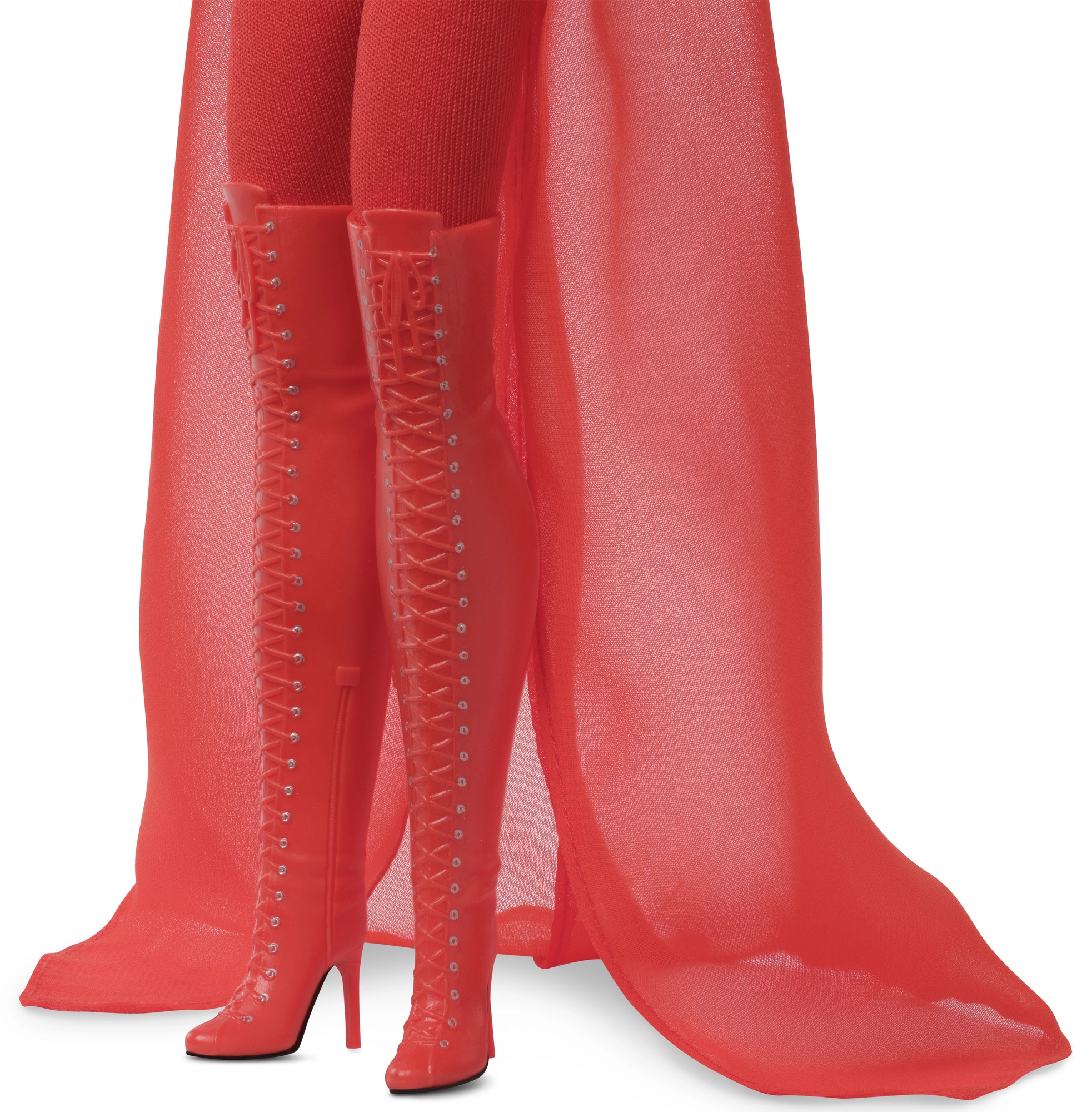 El conjunto incluye un mono rojo ajustado con efecto translúcido y una parte superior corta que se transforma en una larga capa fluida. El look se completa con botas por encima de la rodilla con cordones y tacones altos: una auténtica pieza statement para exhibir.