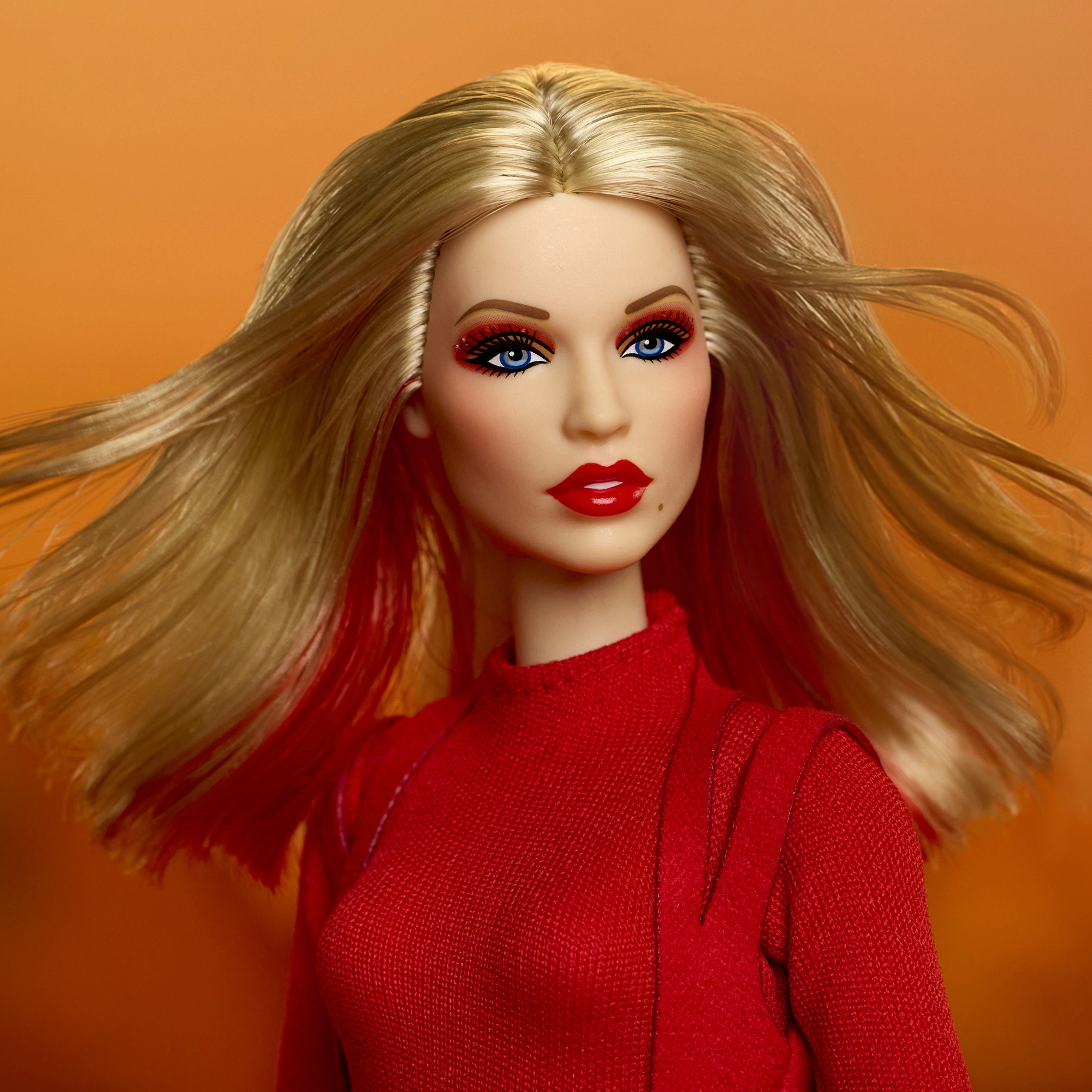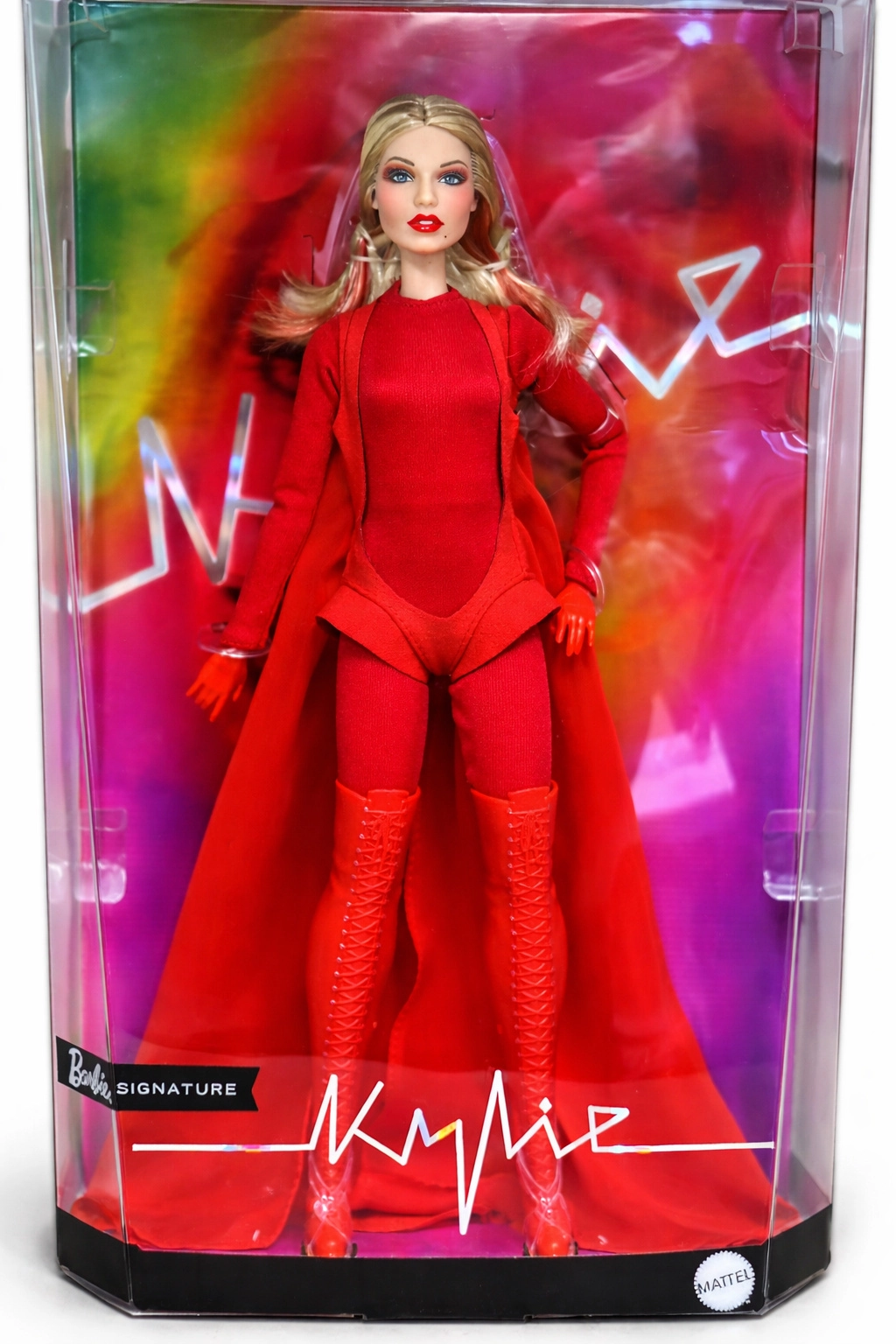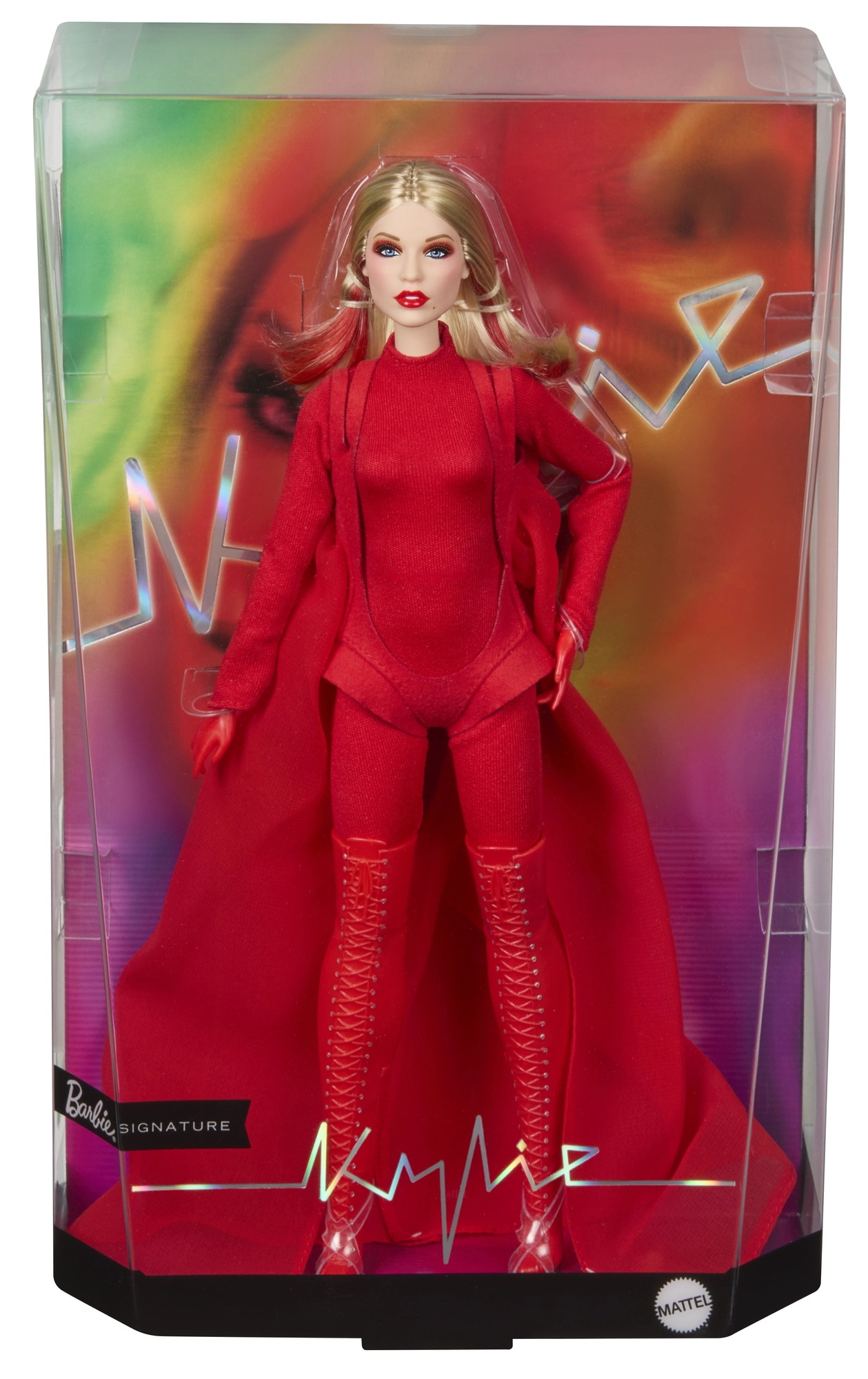 Esta edición de colección de Barbie rinde homenaje a mujeres inspiradoras en la serie Role Models. La muñeca representa a Kylie Minogue con un dramático estilismo rojo inspirado en un videoclip musical, con cabello rubio largo y sutiles mechas rojas, ojos azules y un maquillaje preciso para un look auténtico de escenario.