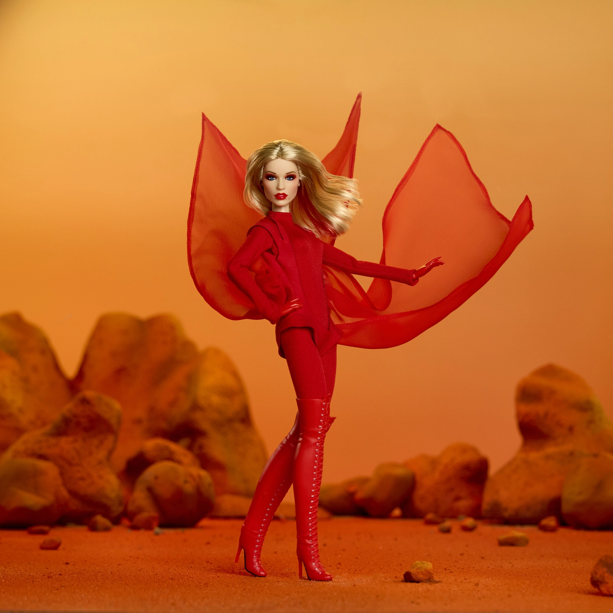 - Diseño para fans del pop: intensos tonos rojos, capa impactante y detalles de moda.