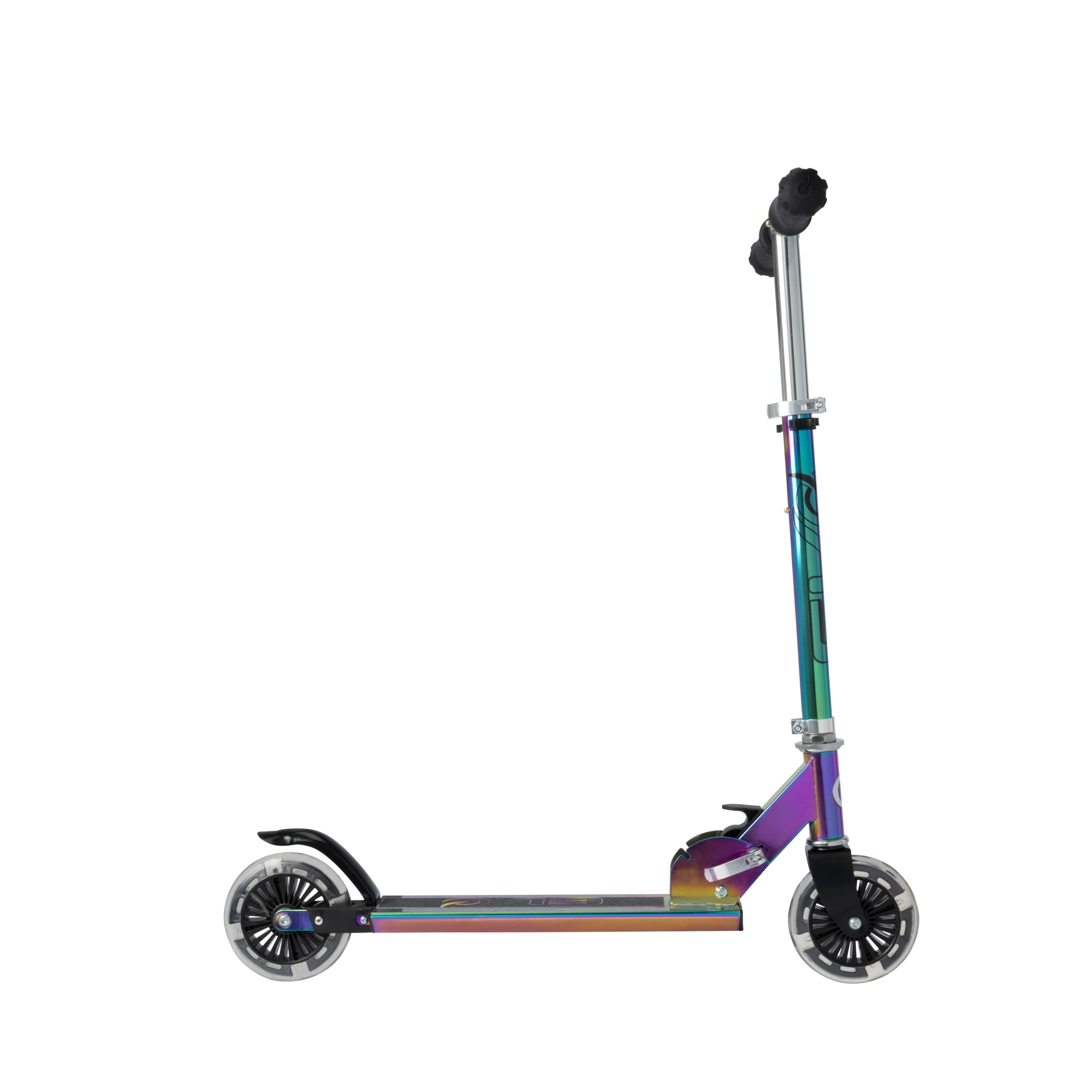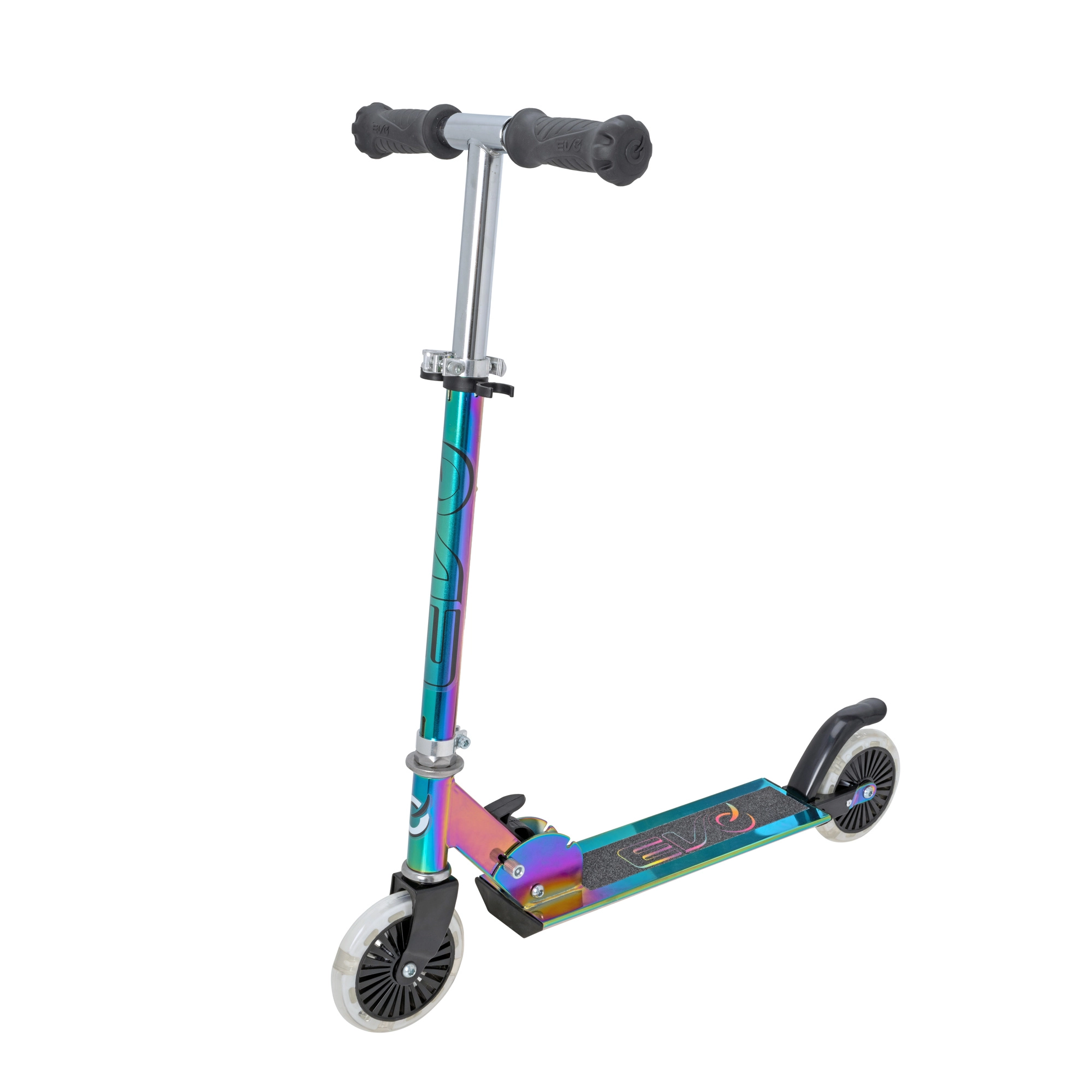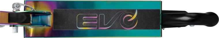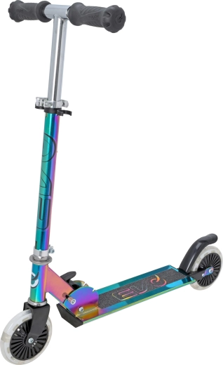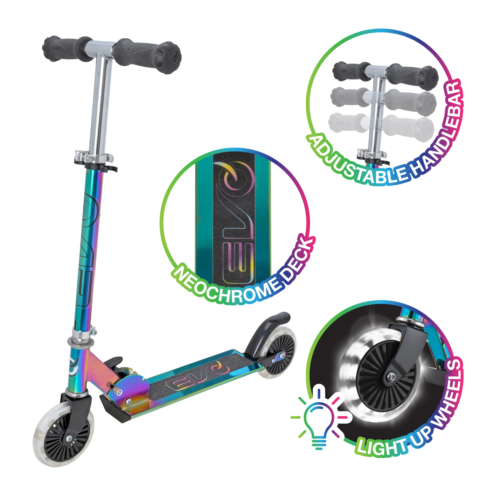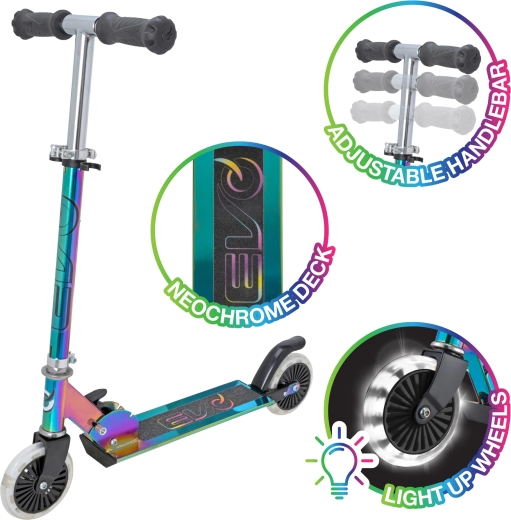 El patinete EVO Light Up Neochrome es una gran elección para pequeños riders que quieren destacar. Gracias al manillar ajustable (aprox. 67–77 cm) crece con el niño, el mecanismo de plegado facilita el transporte y el almacenamiento, y la robusta estructura metálica con plataforma antideslizante aporta seguridad durante la conducción.