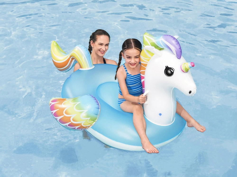 Adorable flotador inflable con forma de unicornio de la marca Bestway que encantará a niños y padres. Ofrece un asiento espacioso, 2 asas robustas para mayor seguridad durante el uso, válvulas de seguridad y resistente vinilo probado de 0,22 mm. Ideal para piscina, lago y mar para diversión y relax.