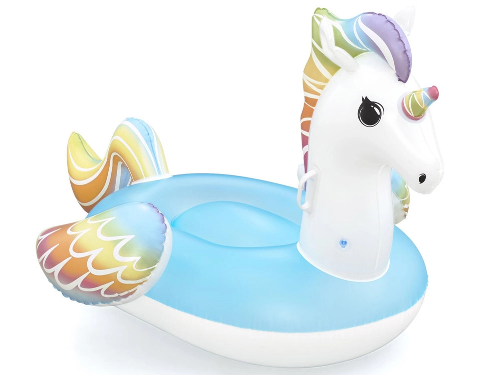 Alas coloridas, crin y cola arcoíris llaman la atención a primera vista. El asiento amplio y las asas hacen de este flotador un compañero favorito para la piscina.