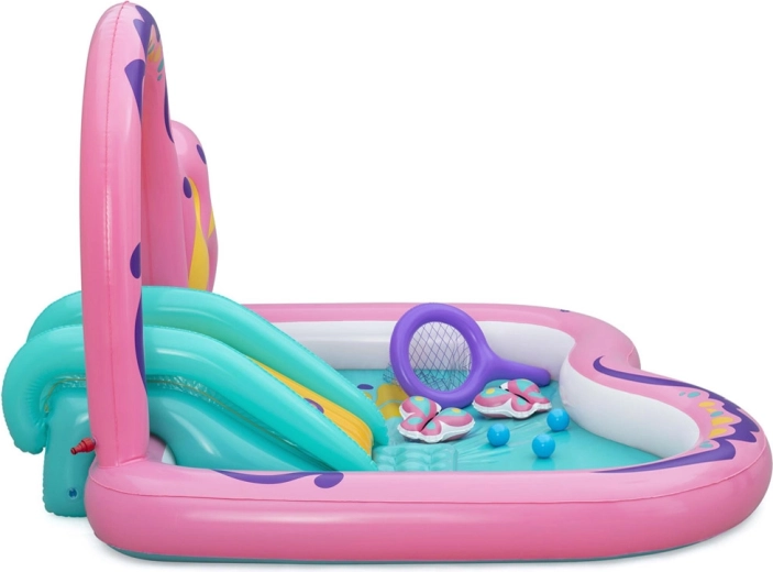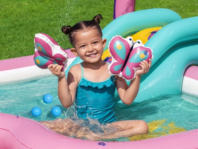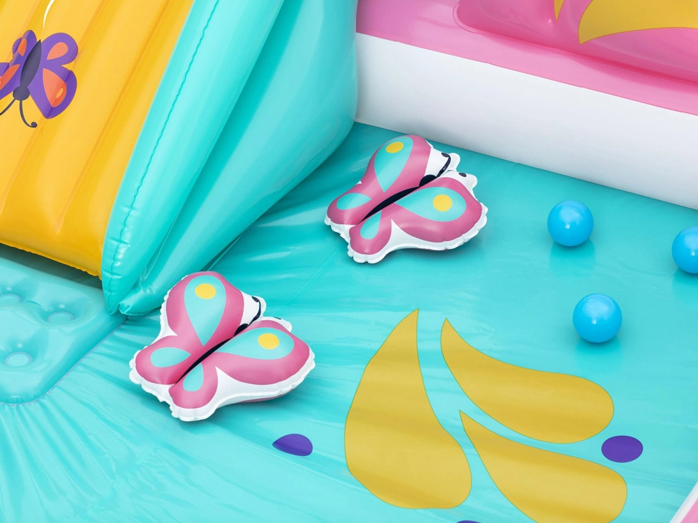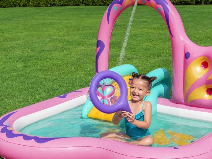 Ilumina los días de verano con el centro de juegos Bestway Mariposa: un parque acuático adorable, seguro y divertido para niños a partir de 2 años. Ofrece una suave rampa deslizante, una ducha en arco para un refresco delicado y orificios interactivos para clasificar pelotas. El diseño en tonos pastel y los accesorios inflables fomentan el movimiento, la coordinación y el juego creativo en el jardín.