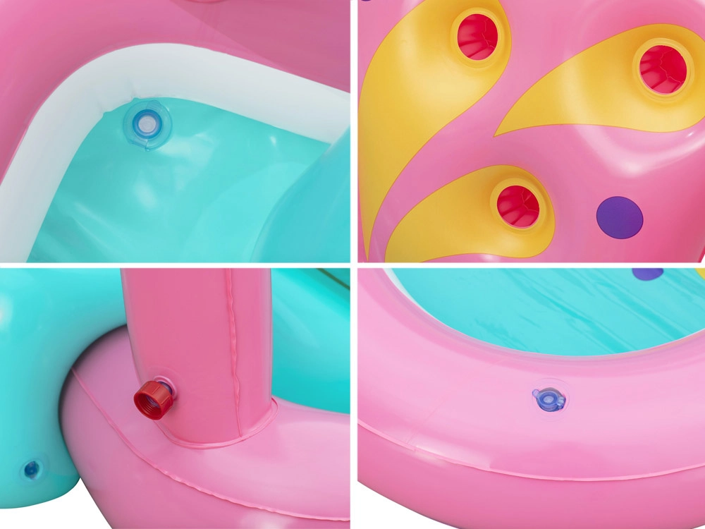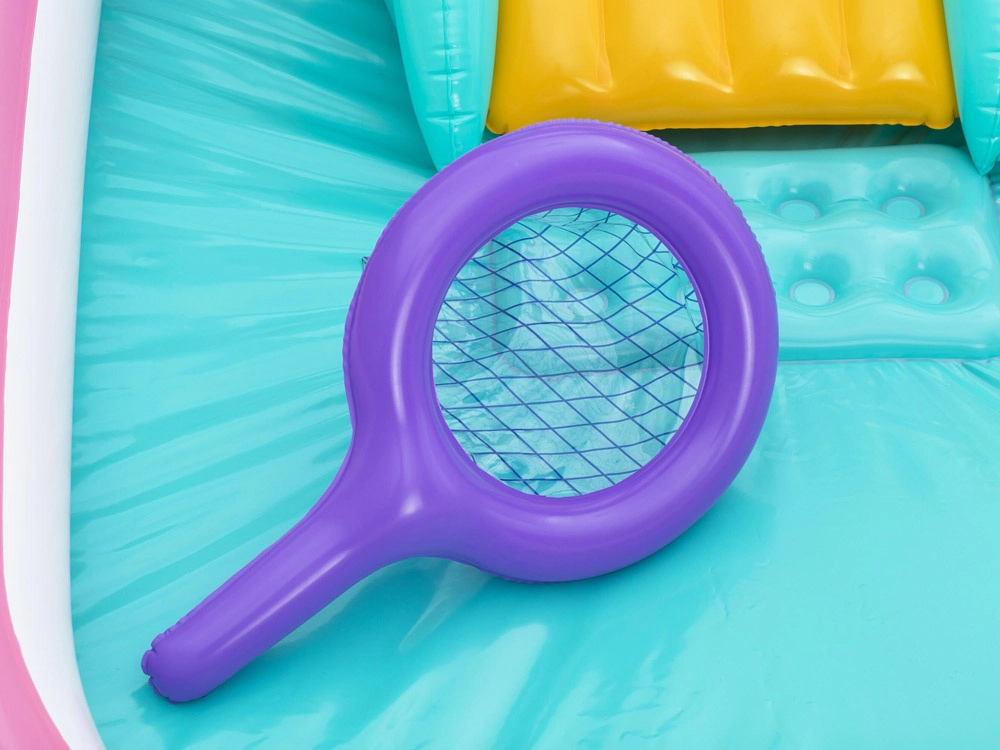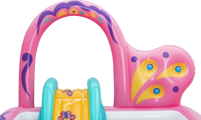 Incluye divertidos juguetes flotantes y elementos inflables con forma de mariposas y aros. Las paredes suaves y los aterrizajes acolchados aumentan la comodidad y la seguridad. El vinilo resistente se limpia con facilidad y el parche de reparación incluido prolonga la vida útil. Solo hay que conectar la manguera, inflar y la diversión puede comenzar.