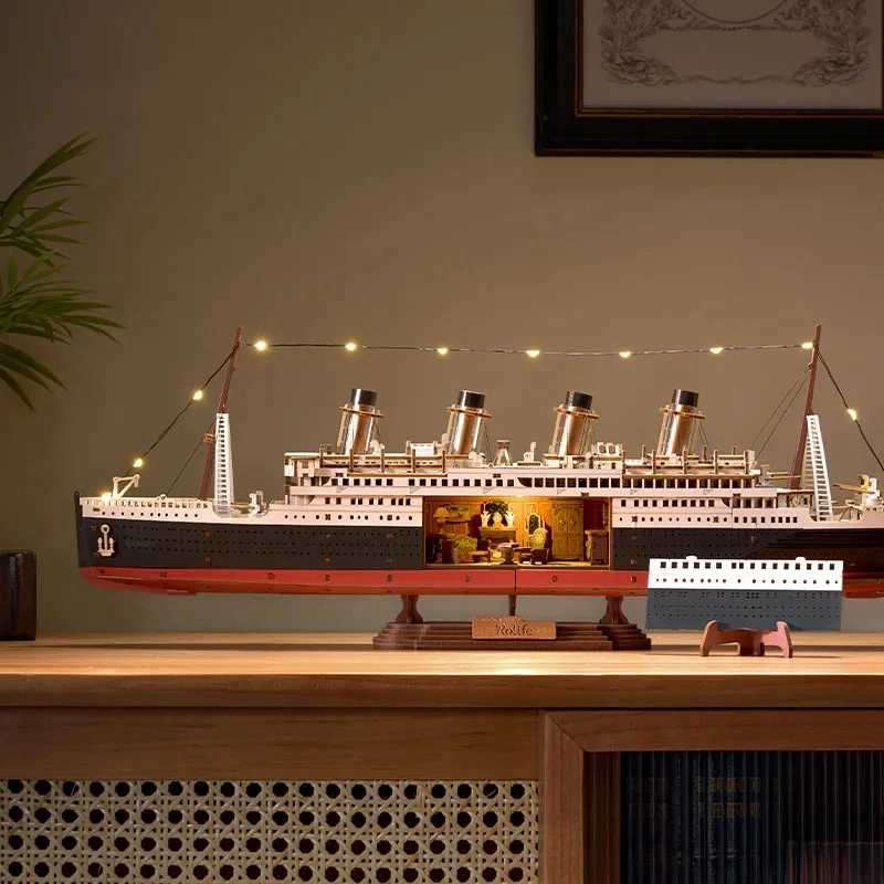 Este kit de diseño DIY ofrece un modelo realista del legendario transatlántico con proporciones precisas, cuatro chimeneas y cubiertas ricamente detalladas. Gracias al panel lateral desmontable podrás asomarte a los camarotes y pasillos, mientras que la iluminación LED cálida realza los detalles del interior y el exterior. Una vez terminado, el modelo funciona como una decoración con estilo para el salón, el despacho o la habitación de estudio.