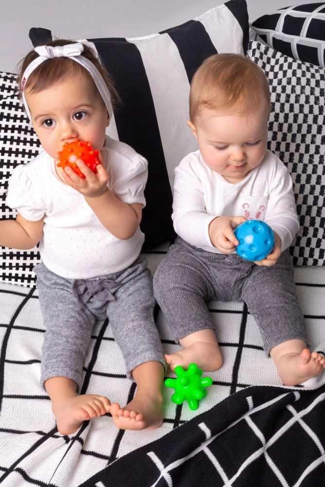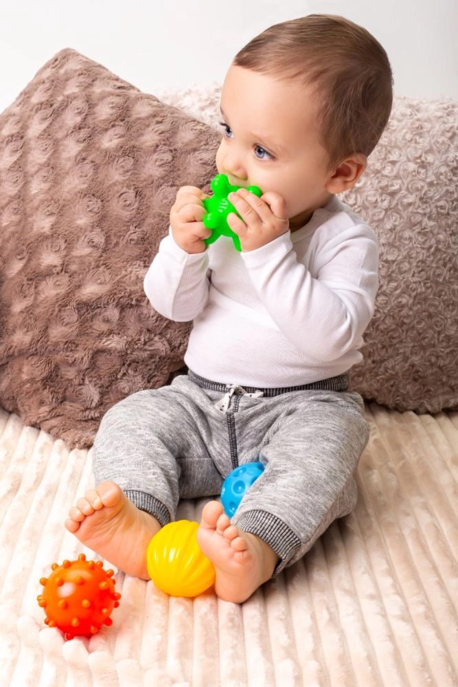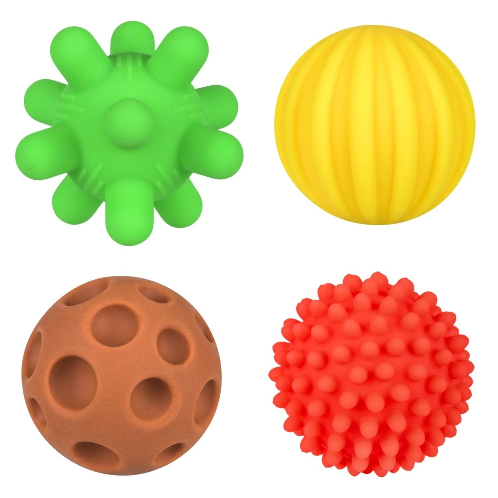 Cada pelota tiene una superficie distinta para varios tipos de estimulación: acanalada, con puntitos, finamente estriada o “con pinchos” para masajear las palmas. Su diseño blando y comprimible es delicado con las encías y favorece un mordisqueo seguro.