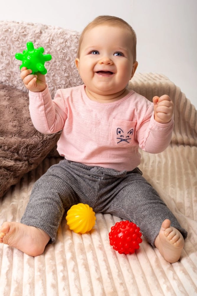 Cada pelota ofrece una superficie distinta para estimular el tacto, masajear las palmas y entrenar el agarre: ideal para el desarrollo de la motricidad fina.