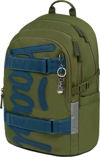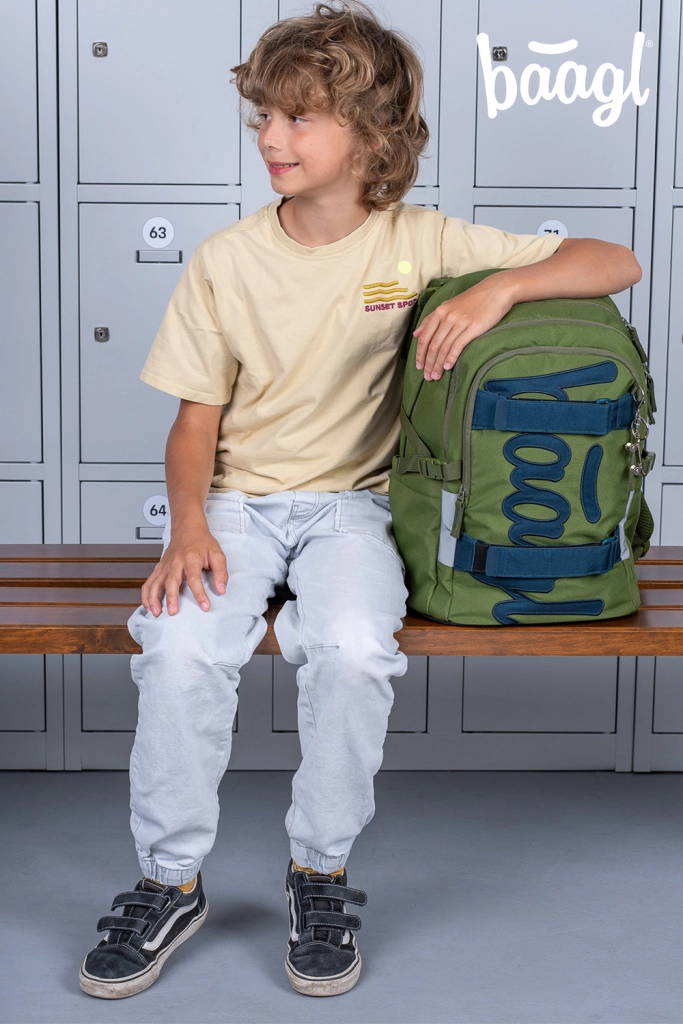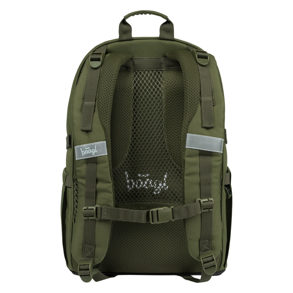 La mochila escolar BAAGL Skate Olive GRS, ligera y resistente, es ideal para alumnos a partir de 3.º de primaria. Ofrece espalda anatómicamente moldeada, 3 compartimentos espaciosos, bolsillo acolchado para portátil de 15", correas para sujetar el monopatín y numerosos elementos reflectantes para mayor seguridad. Fabricada con material reciclado e impermeable y cremalleras de calidad YKK.