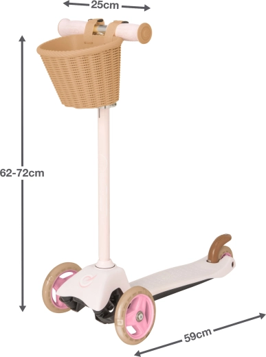 La práctica cesta desmontable en el manillar permite llevar pequeños favoritos a cualquier parte. La altura regulable del manillar 62–72 cm y la construcción ligera facilitan el manejo y el transporte. Gracias a su atractiva color rosa, los niños se enamorarán rápidamente y los padres apreciarán los detalles de seguridad bien pensados.