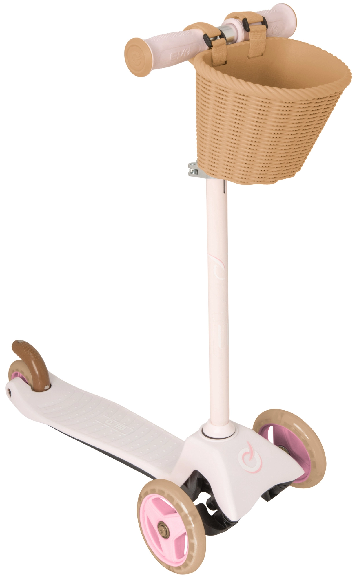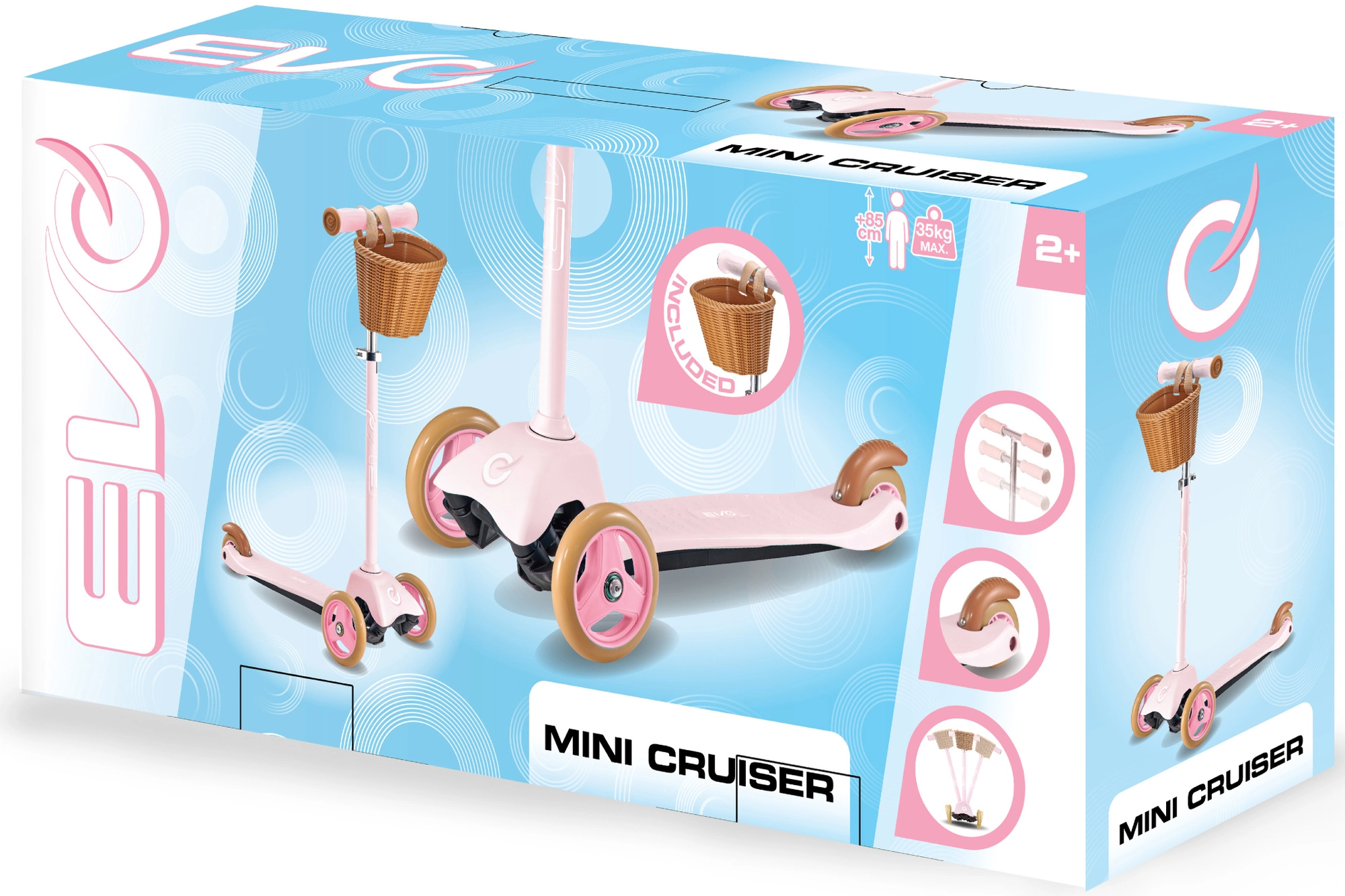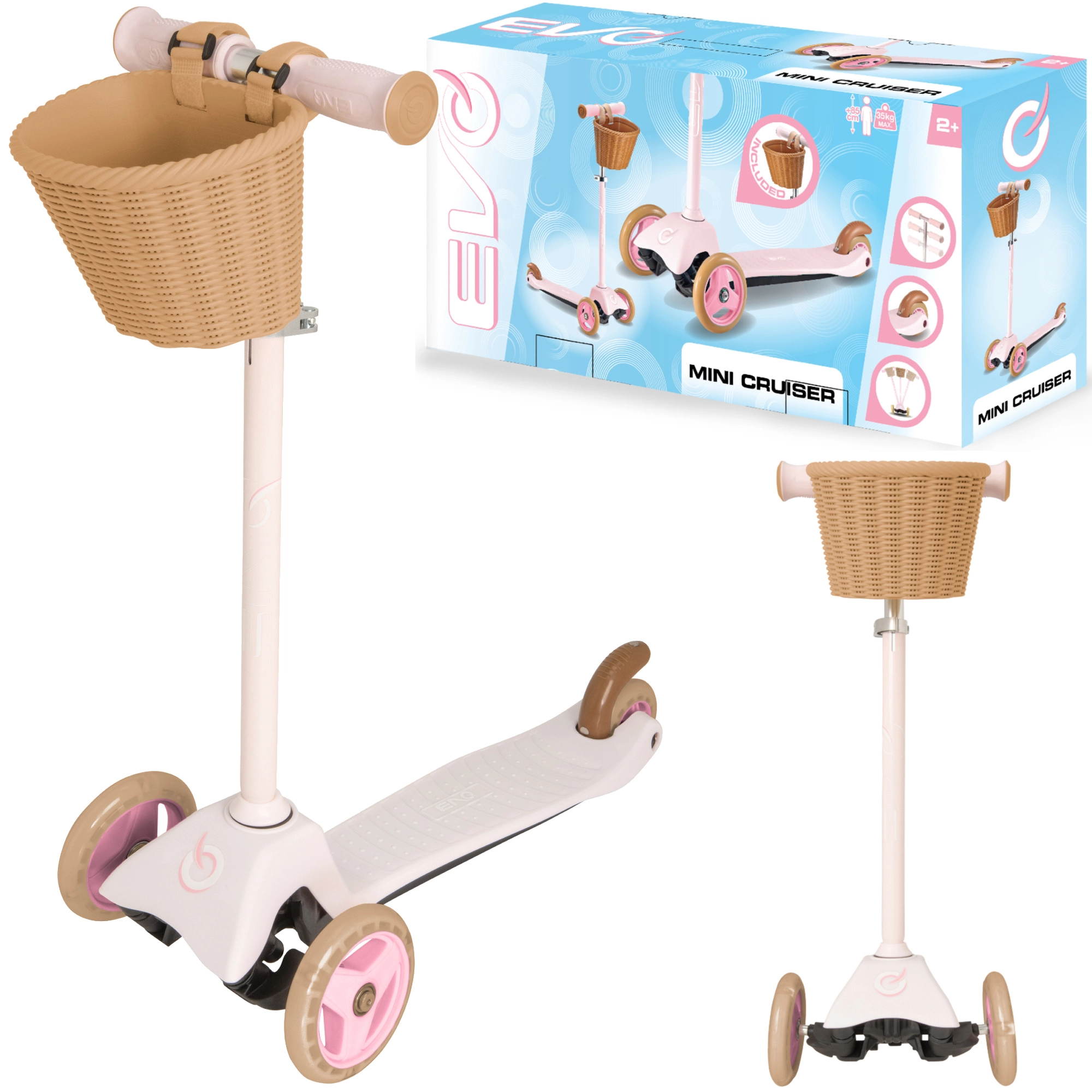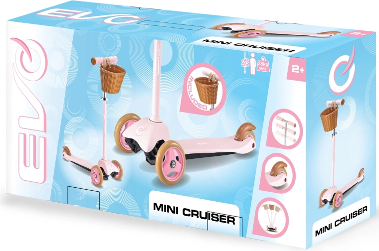 El patinete rosa EVO Mini Cruiser es ideal para los más pequeños a partir de 2 años. Gracias a sus tres ruedas, la amplia y estable base y el freno trasero de pie, los niños aprenden equilibrio y coordinación de forma segura y divertida. El manillar con altura regulable crece con el niño y la cesta desmontable guarda pequeños objetos para el camino.