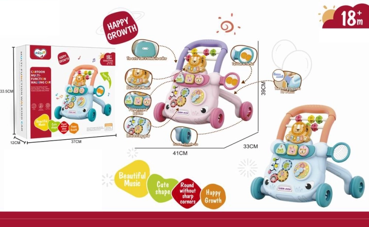 Descubre el divertido andador empujable con forma de león en un elegante color rosa, que favorece los primeros pasos y las habilidades motoras de niños a partir de 18 meses. Ofrece efectos de sonido, plástico seguro sin bordes afilados y dimensiones compactas para un uso cómodo en casa. También incluye 4 pelotas/bolitas de colores para aún más diversión.