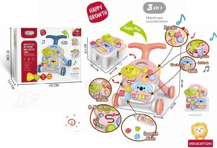 Este juguete inteligente crece con tu hijo: desde los primeros pasos hasta la exploración independiente. El panel interactivo con piano, ruedas giratorias, cuentas en cordones y una concha abatible enseña de forma divertida a distinguir colores, formas y sonidos, estimulando la cognición y la motricidad fina. La altura ajustable del asa y el montaje sencillo permiten cambiar rápidamente entre el modo andador, mesa y panel independiente.