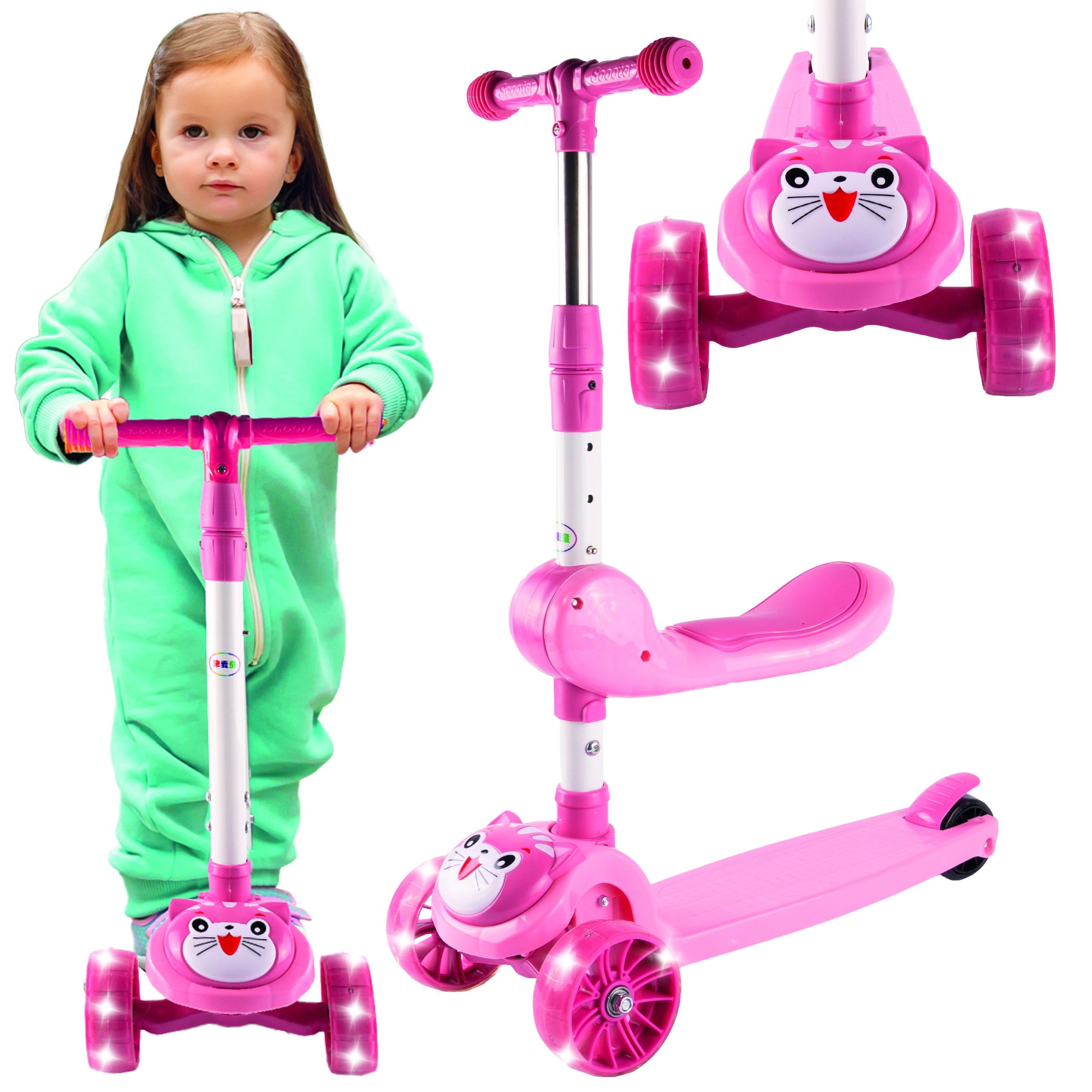 Este patinete infantil de tres ruedas Kotek ofrece conducción estable, manillar ajustable y ruedas LED luminosas para mayor seguridad y diversión. Gracias a la plataforma antideslizante y al freno trasero de pie, es ideal para los primeros paseos de los pequeños. El práctico asiento garantiza comodidad en salidas más largas.