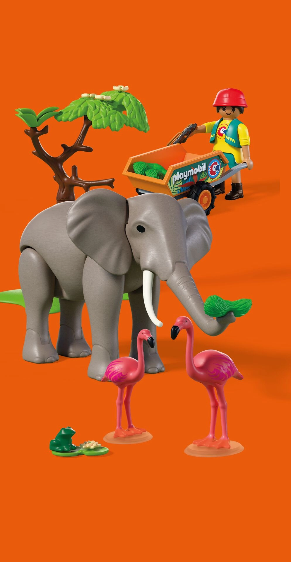 - Elefante, cuidadora; animales acompañantes: flamencos, ranita