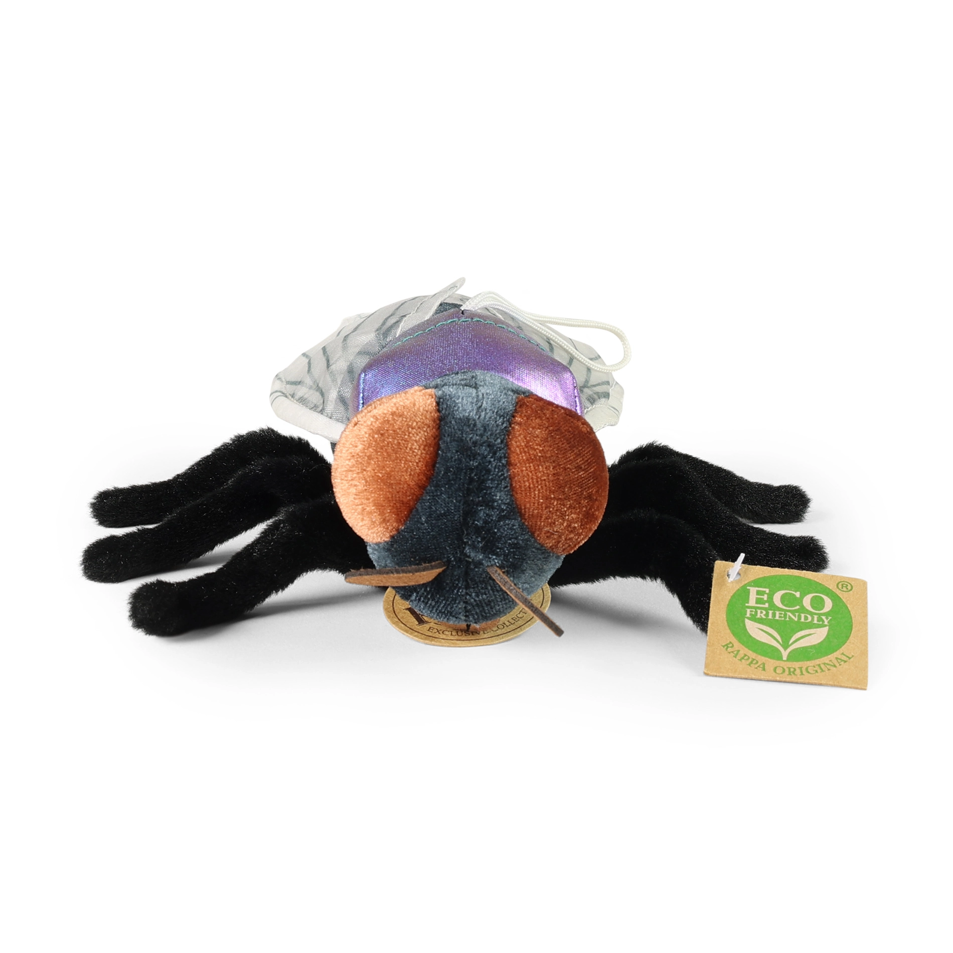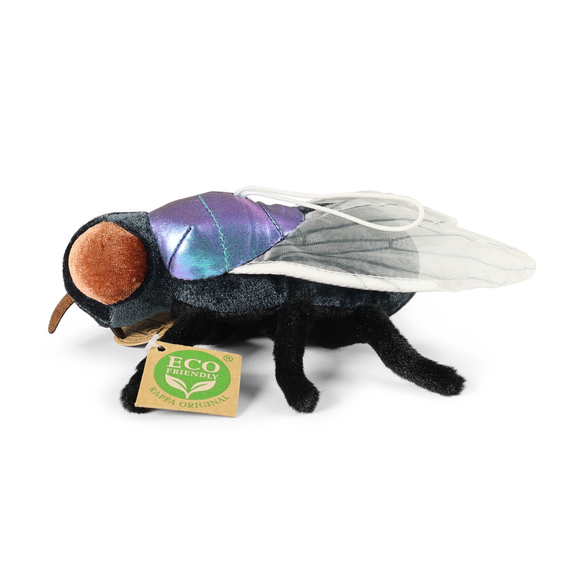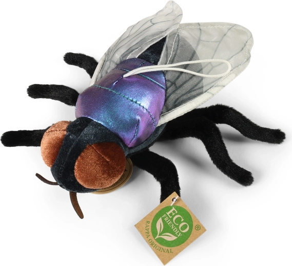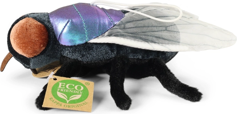 Esta mosca de peluche, trabajada con detalle, destaca por sus alas brillantes, ojos grandes y una superficie suave agradable al tacto. El relleno de materiales reciclados es totalmente inocuo y promueve un enfoque sostenible sin plásticos innecesarios.