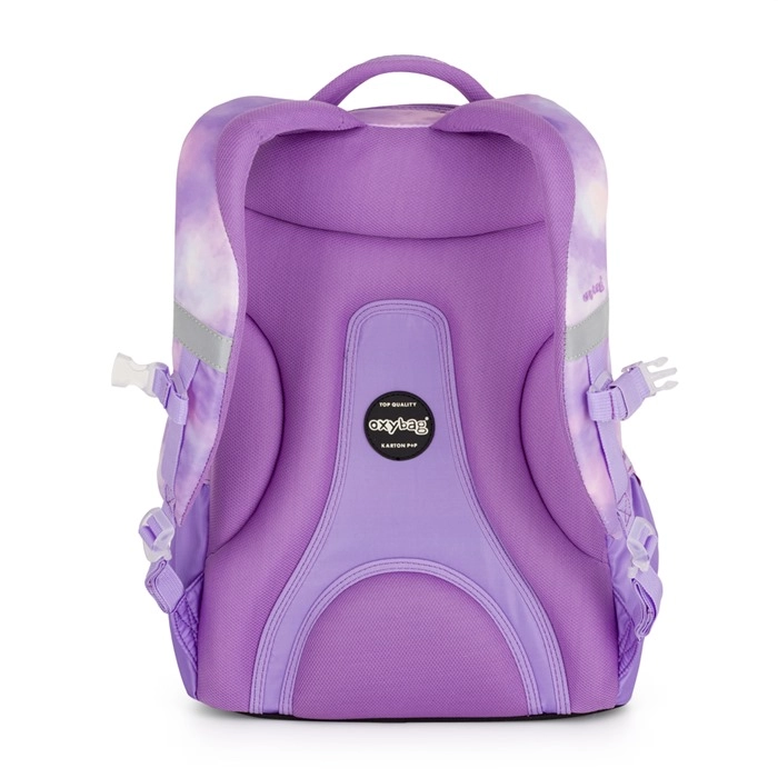 La mochila escolar OXY Ombre Butterfly, con un moderno diseño tie-dye en morado, combina estilo, comodidad y una organización bien pensada. Gracias al panel trasero ergonómico y a los tirantes acolchados y ajustables, se lleva cómodamente incluso con carga completa. La correa pectoral ajustable ayuda a distribuir el peso de forma uniforme y mantiene la mochila estable en la espalda.