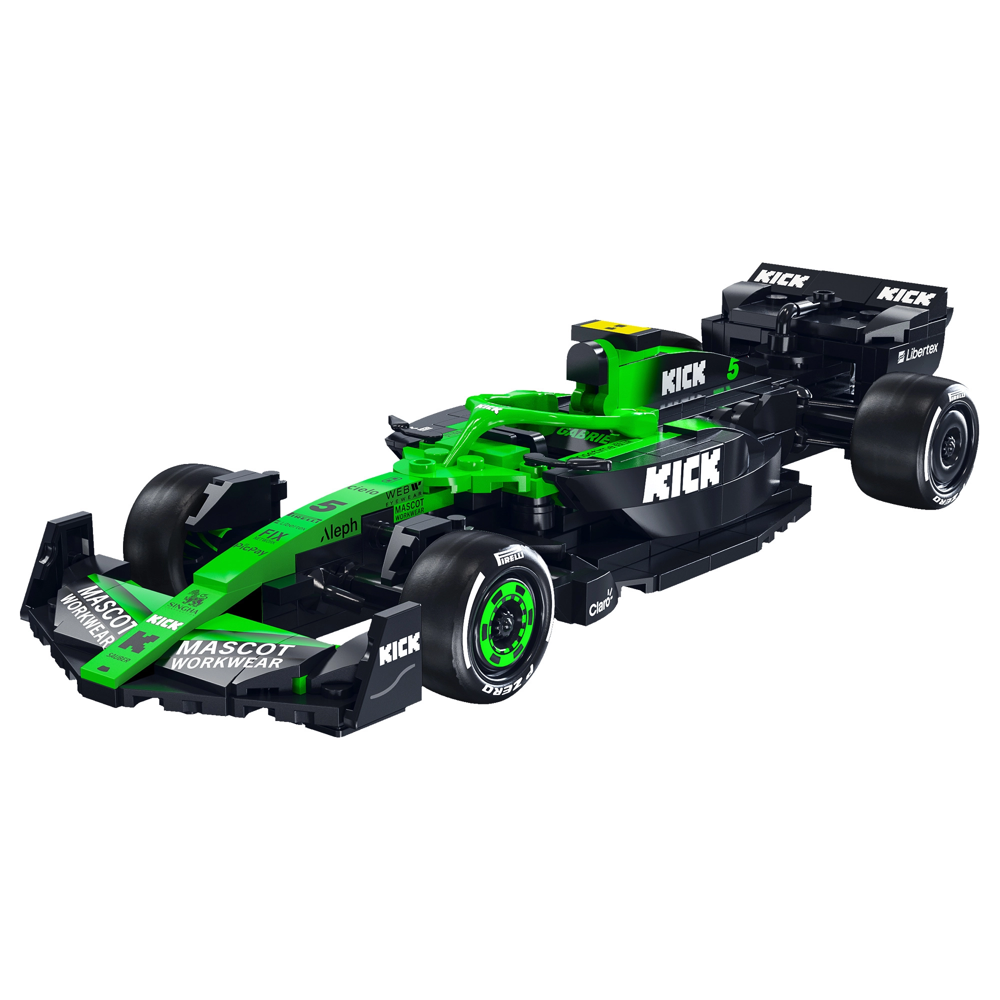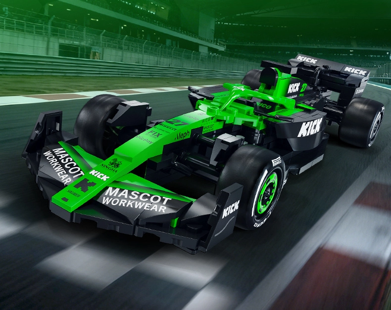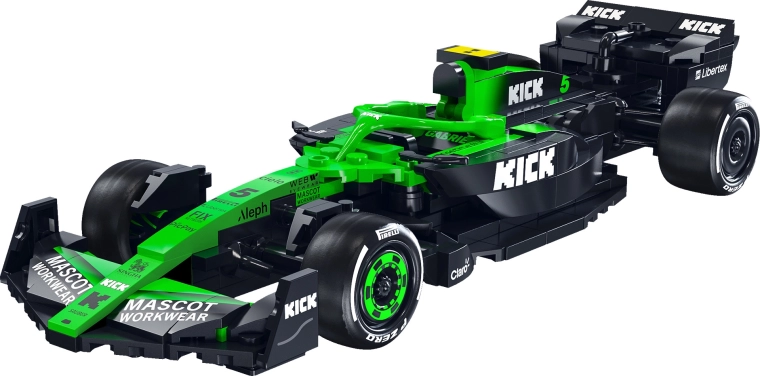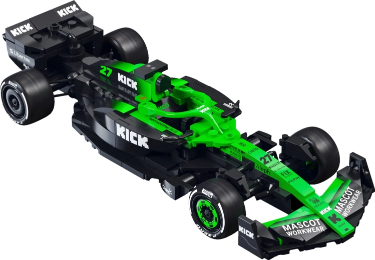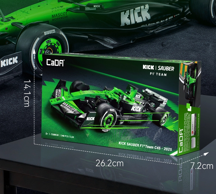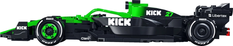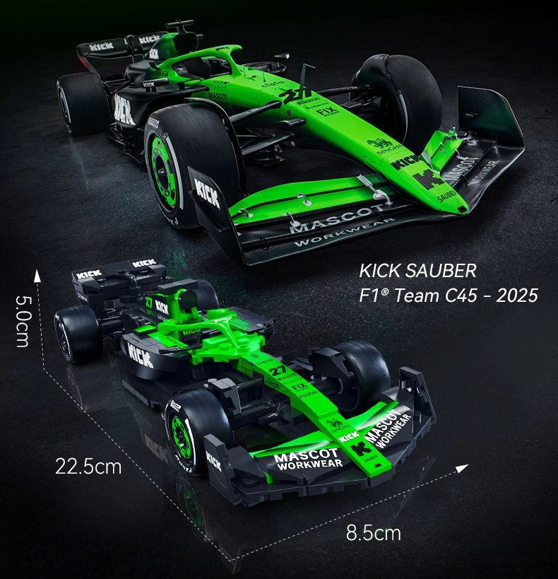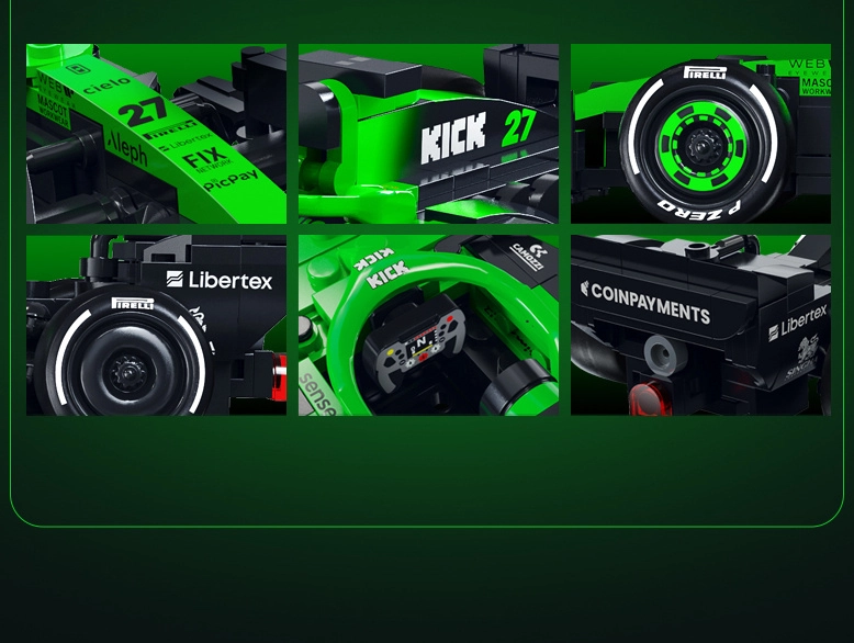 Disfruta de una construcción precisa y del ambiente de las carreras con el modelo KICK SAUBER F1 C45. Su elegante combinación de negro y verde, alas aerodinámicas y gráficos auténticos crean una impresionante réplica de un monoplaza moderno. Gracias a las ruedas funcionales, el modelo se mueve fácilmente sobre superficies lisas, por lo que es perfecto tanto para el juego como para la vitrina.