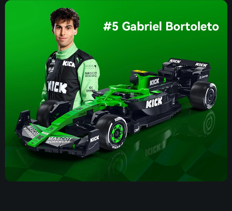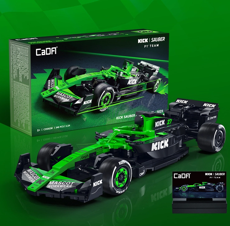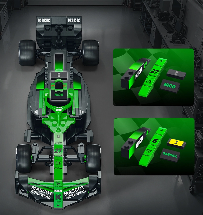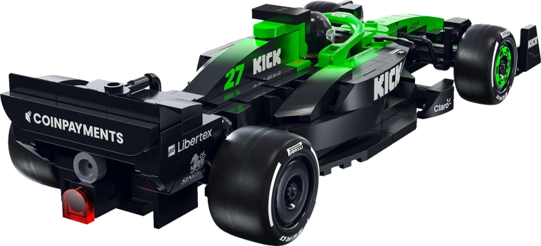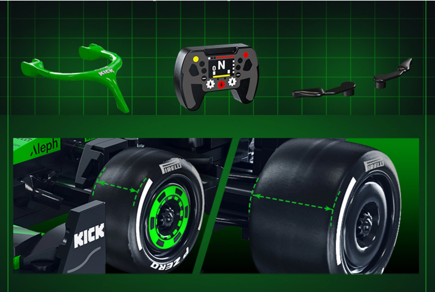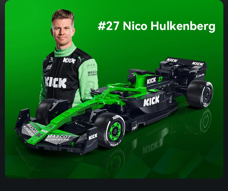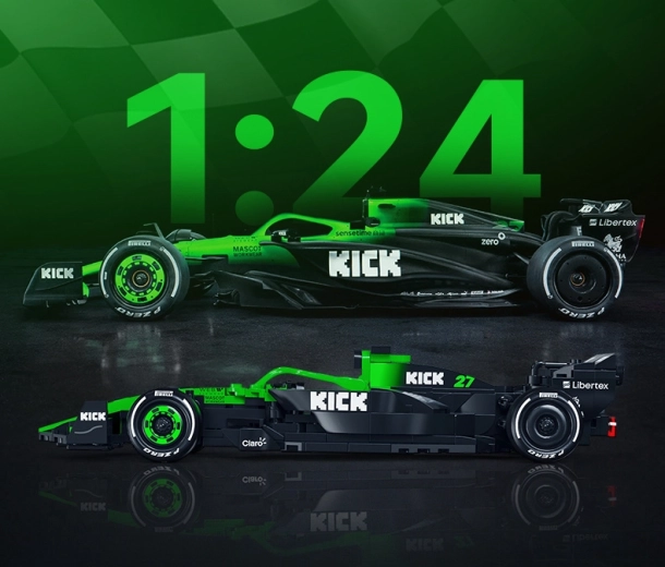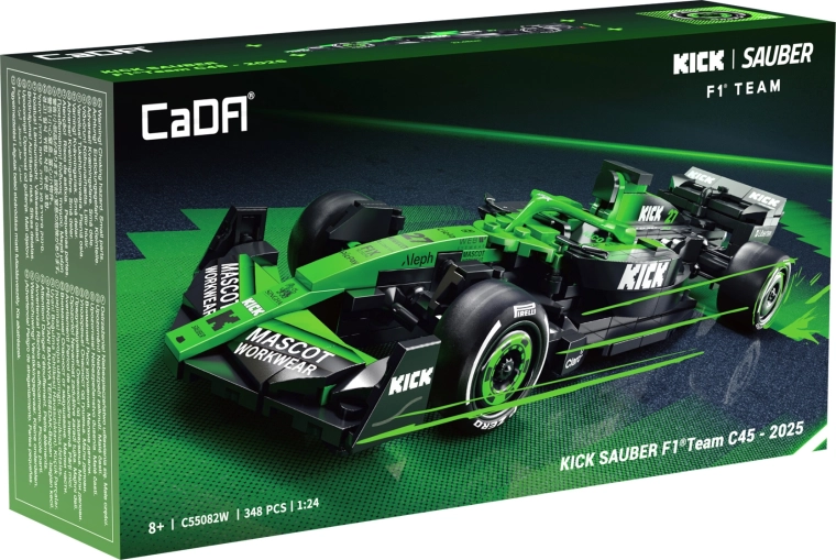 Disfruta de una construcción precisa y del ambiente de las carreras con el modelo KICK SAUBER F1 C45. Su elegante combinación de negro y verde, alas aerodinámicas y gráficos auténticos crean una impresionante réplica de un monoplaza moderno. Gracias a las ruedas funcionales, el modelo se mueve fácilmente sobre superficies lisas, por lo que es perfecto tanto para el juego como para la vitrina.