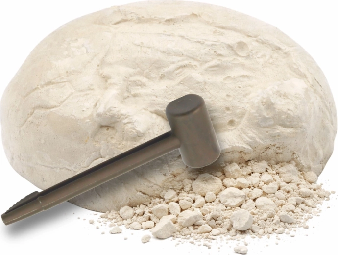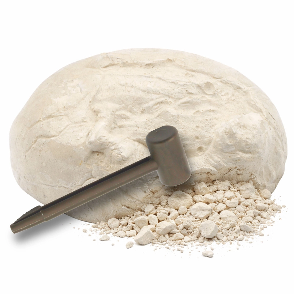 Este set arqueológico interactivo permite a los niños convertirse en pequeños paleontólogos. El objetivo es descubrir la figura de dinosaurio oculta en el huevo de yeso utilizando el cincel y el martillo incluidos. Basta con sumergir el huevo durante unos minutos, dejar que el material se ablande y luego retirar con cuidado las capas de la “roca”.
