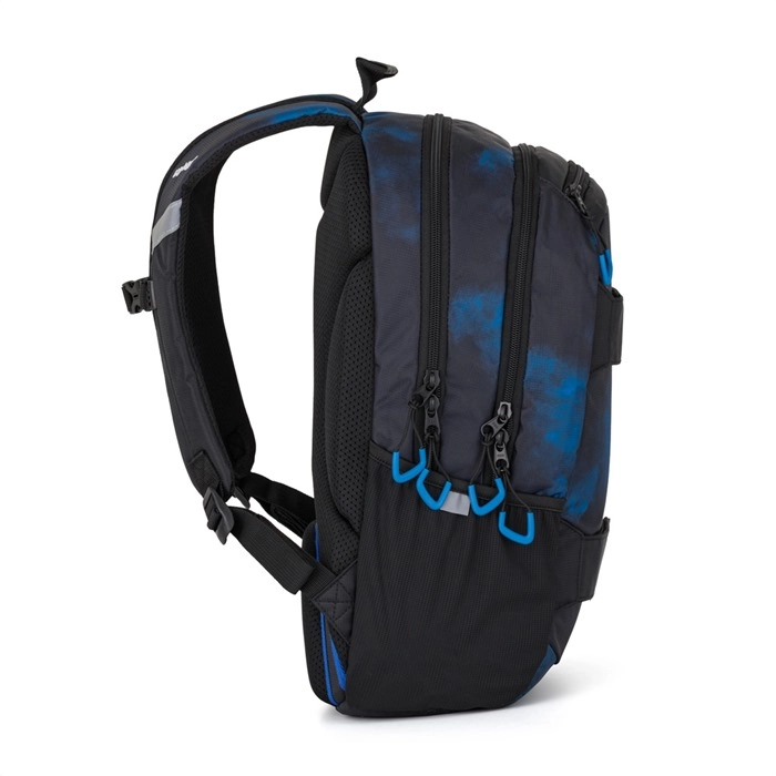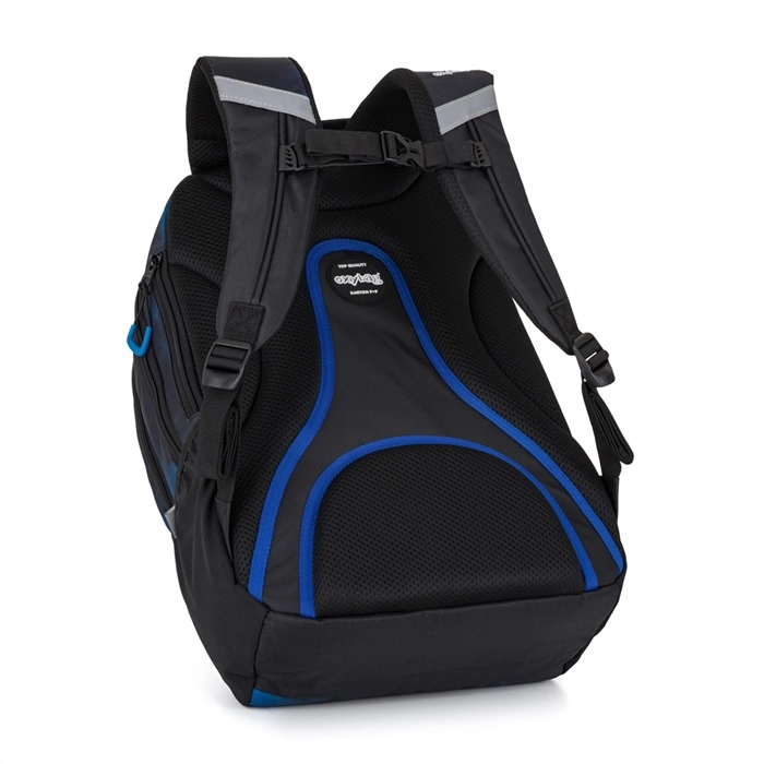 El espacio interior está inteligentemente resuelto: dos compartimentos principales para libros y carpetas, bolsillo reforzado que protege el portátil con seguridad, bolsillo pequeño y mosquetón que mantienen el orden en los accesorios. Un práctico bolsillo oculto en la espalda guarda los objetos de valor, y el bolsillo lateral está listo para la botella. Los elementos reflectantes aumentan la visibilidad en el camino a la escuela y de vuelta a casa.