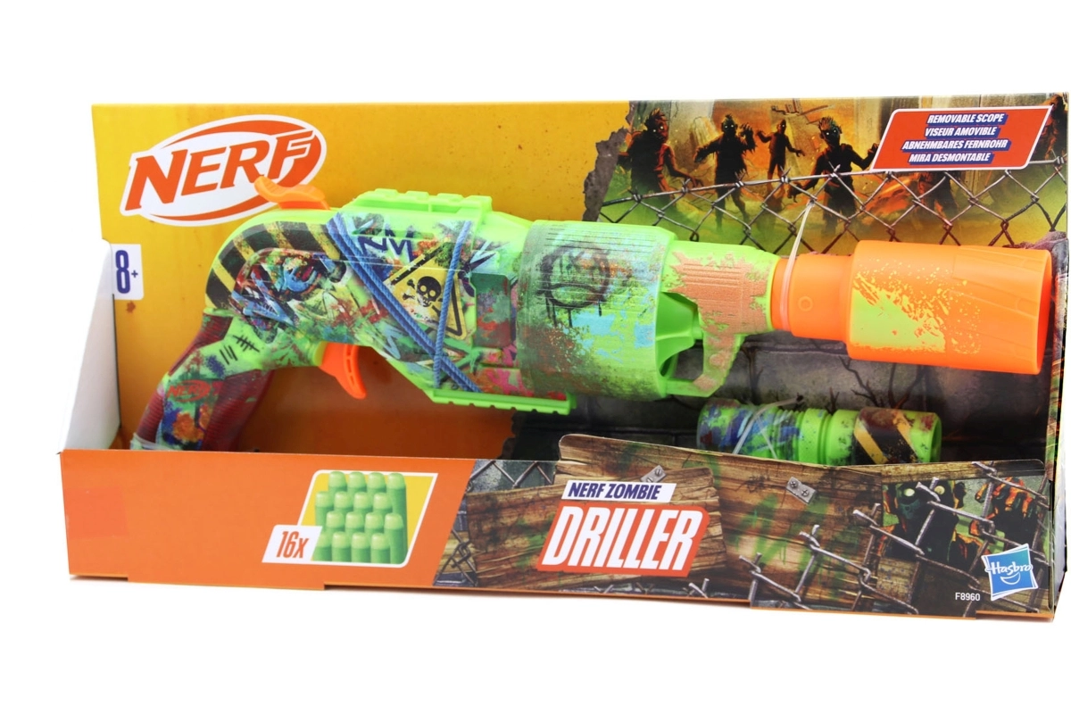 El bláster Nerf Zombie Driller ofrece un aspecto único inspirado en el mundo zombi: parece un taladro transformado y listo para la batalla. Su hipnótico estampado con motivos de grafiti y divertidos detalles lo convierten en el complemento perfecto para juegos temáticos, fiestas y combates de acción con amigos. El visor desmontable ayuda a apuntar y los 16 dardos incluidos garantizan mucha diversión.