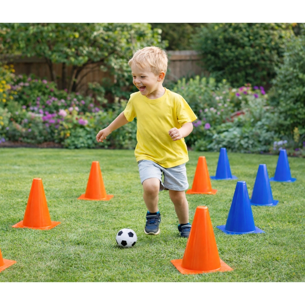 Los conos en llamativos colores naranja y azul ayudan a los niños a seguir mejor el recorrido y aumentan la seguridad del entrenamiento tanto en el campo como en el jardín.