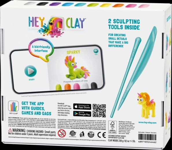 Incluye un código de acceso a la aplicación móvil HEY CLAY, que ofrece tutoriales animados paso a paso. Así, los niños aprenden de forma lúdica a dar forma a las distintas partes y a ensamblarlas en figuras finales. Las dos herramientas incluidas facilitan el modelado de detalles y texturas.