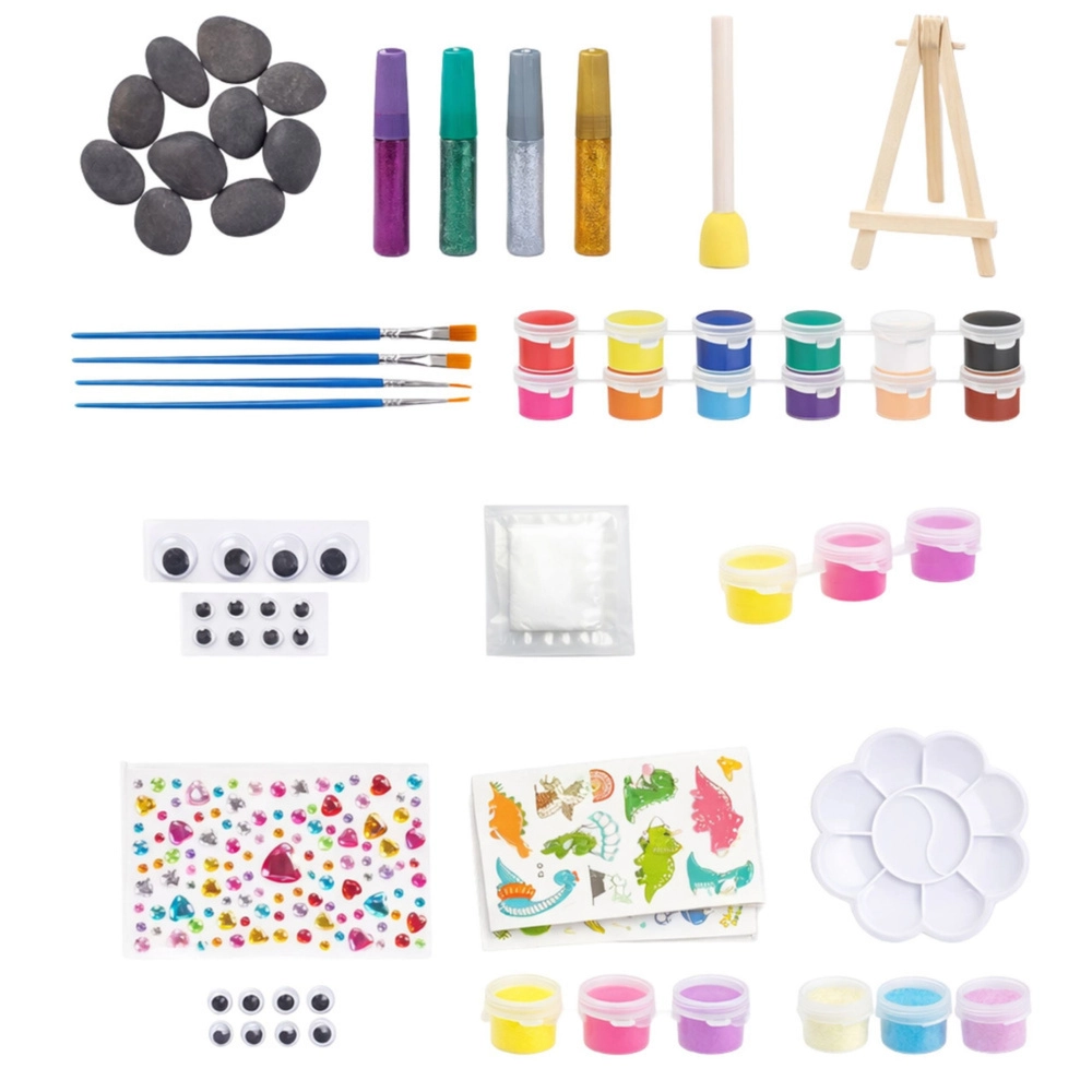 - 10 piedras, 12 pinturas estándar, 3 pinturas luminosas, 4 pegamentos con purpurina, 4 pinceles, 2 esponjitas, paleta para mezclar, 12 ojos móviles, hoja de pegatinas transferibles, hoja de cristales decorativos, soporte para exhibición, guantes desechables